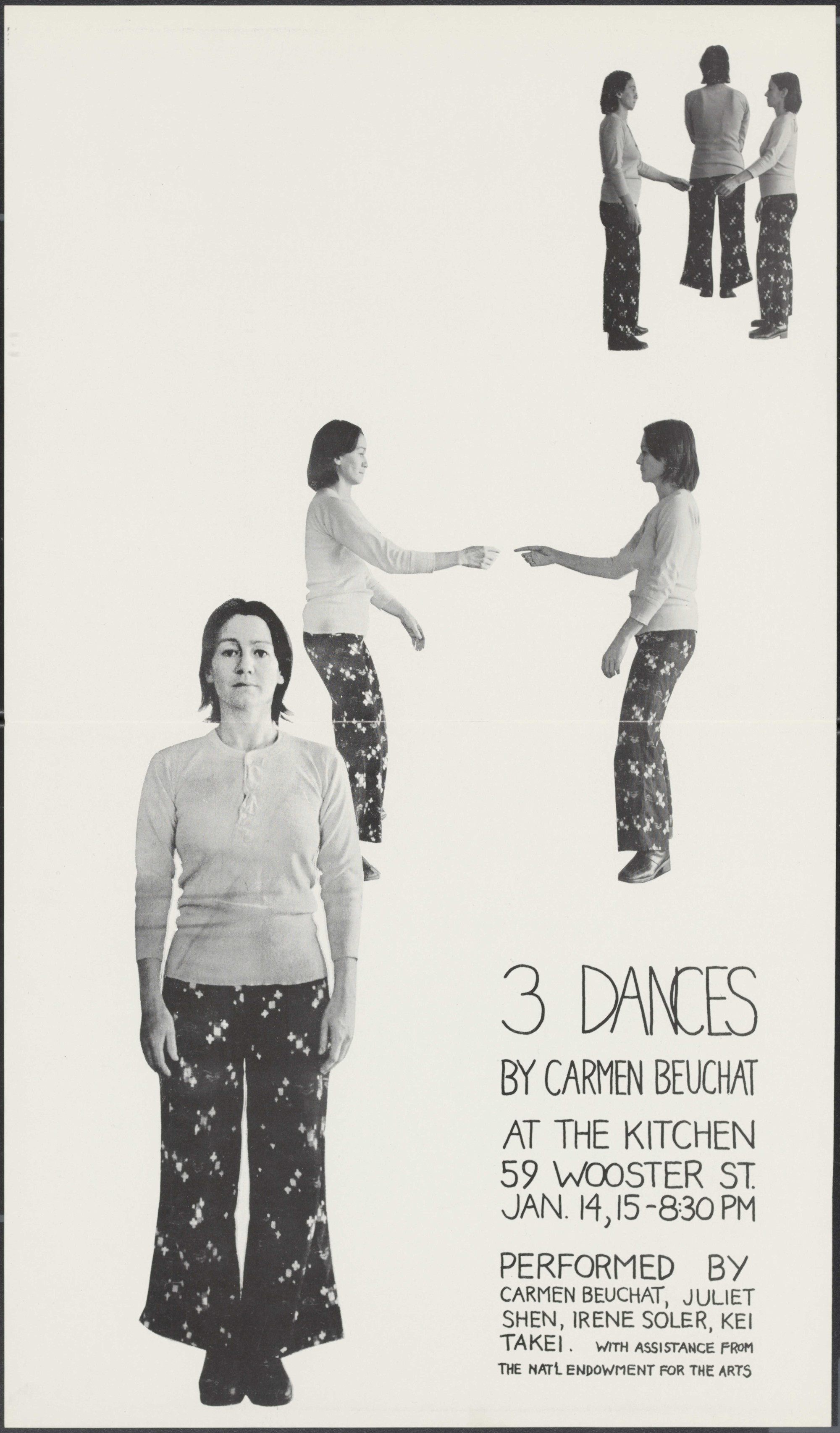 3 Dances by Carmen Beuchat at The Kitchen, 59 Wooster Street. January 14-15, 8:30pm. Performed by Carmen Beuchat, Juliet Shen, Irene Soler, and Kei Takei. With assistance from the NEA.