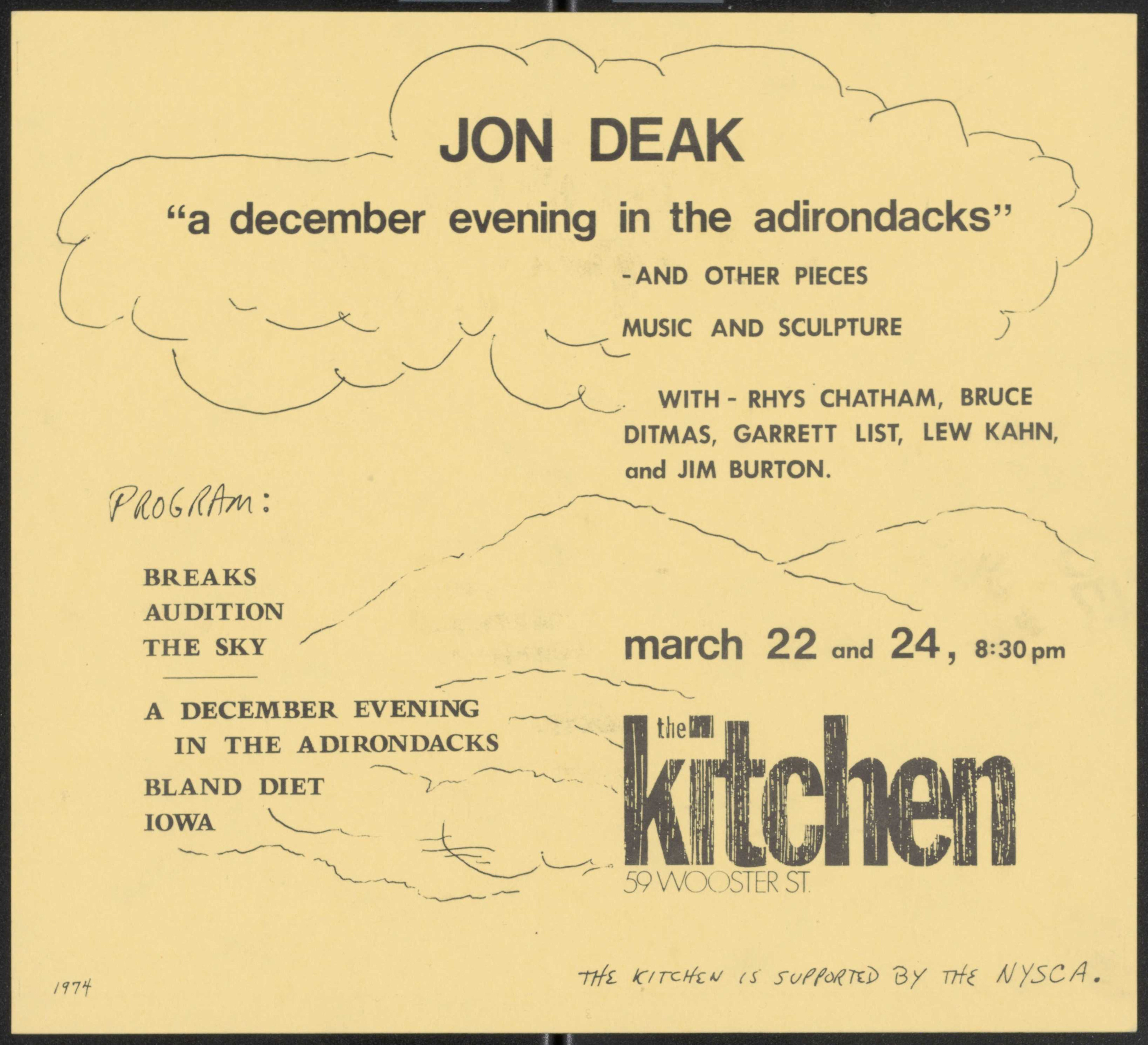 Jon Deak: "a december evening in the adirondacks" and other pieces. With Rhys Chatham, Bruce Ditmas, Garrett List, Lew Kahn, and Jim Burton. Program: Breaks, Audition, The Sky, A December Evening in the Adirondacks, Bland Diet, and Iowa. March 22nd and 24th at 8:30pm