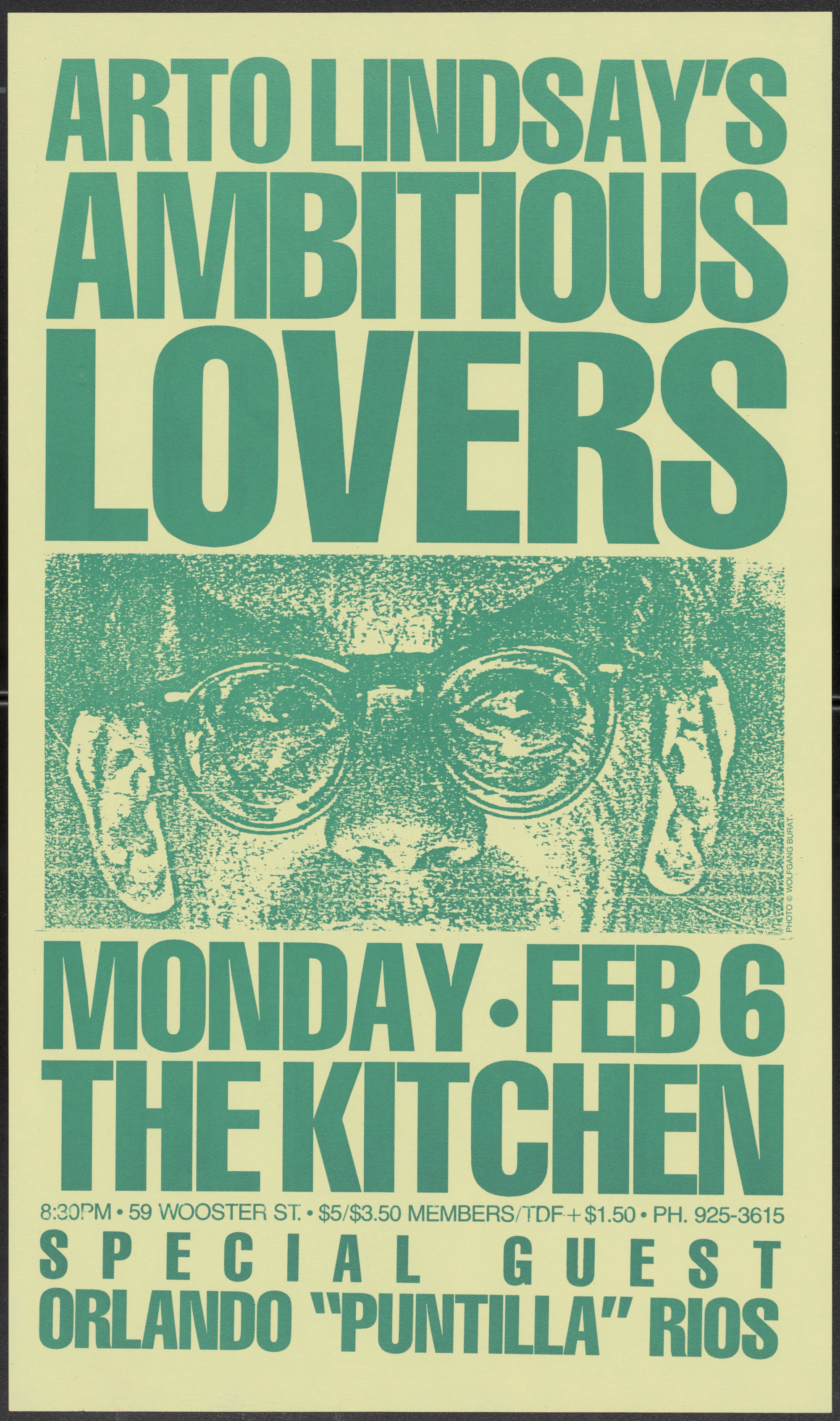 Formed in 1983, Arto Lindsay's band Ambitious Lovers performed live at The Kitchen on February 6, 1984. The group included Lindsay, David Moss, Mark Miller, Jorge Silva, and Toni Nogueira. This performance featured special guest Orlando "Puntilla" Rios, a Cuban percussionist belonging to the group Nueva Generacion. Rios prepared a group for the performance, including Daniel Ponce and Gene Golden playing congos and batá, and Olufemi Mitchell singing and playing percussion.