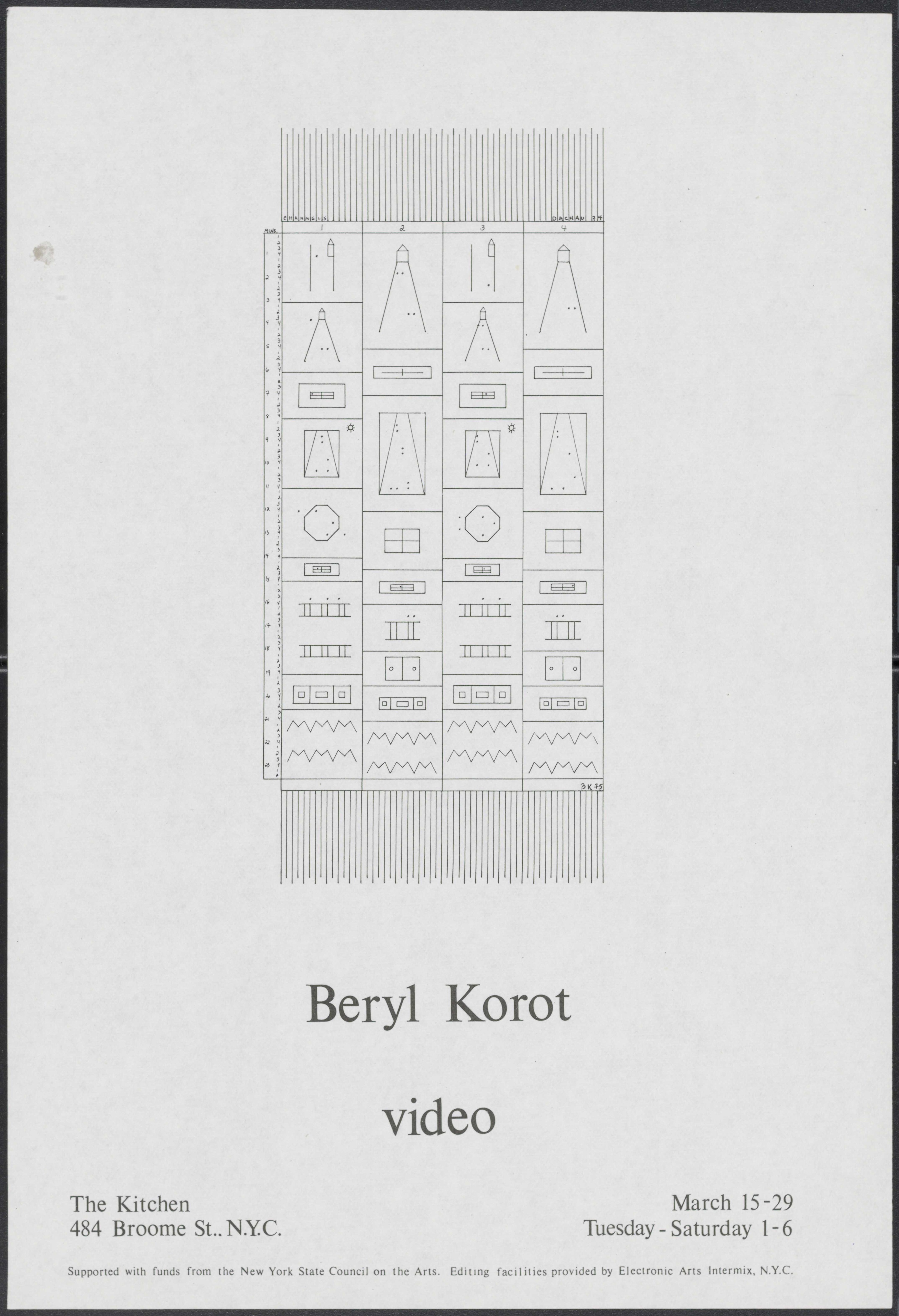 Artist(s): Beryl KorotDate: March 15, 1975-March 29, 1975Beryl Korot: Video. March 15-29, Tuesday-Saturday 1-6pm.