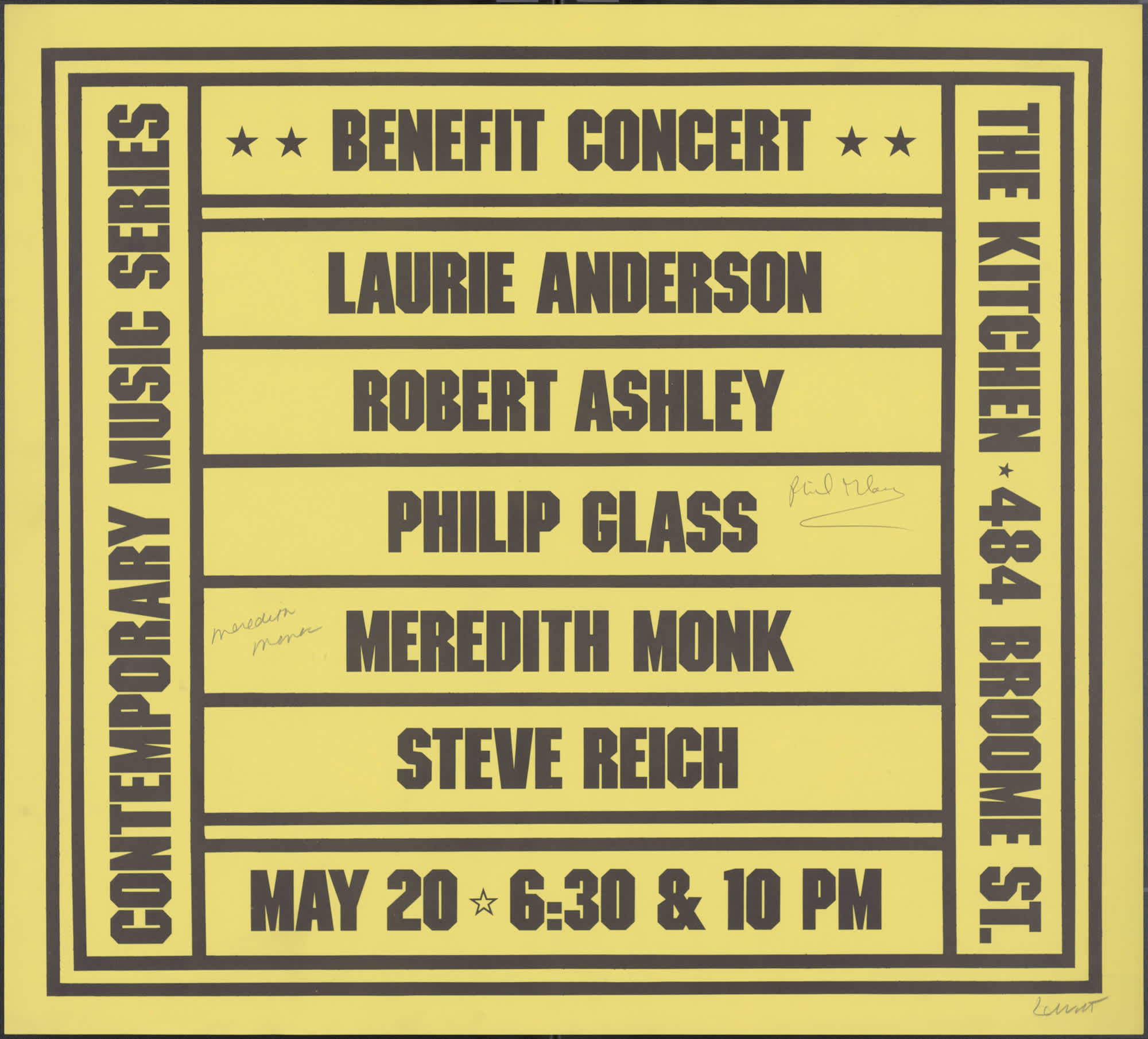 Limited Edition Poster designed by Sol Lewitt. There are 4 copies on a darker yellow, heavier stock paper and 4 copies on a lighter color paper. There are two copies of each weight that are signed by Meredith Monk and Philip Glass. All copies are signed by Sol Lewitt. Design by Sol Lewitt.