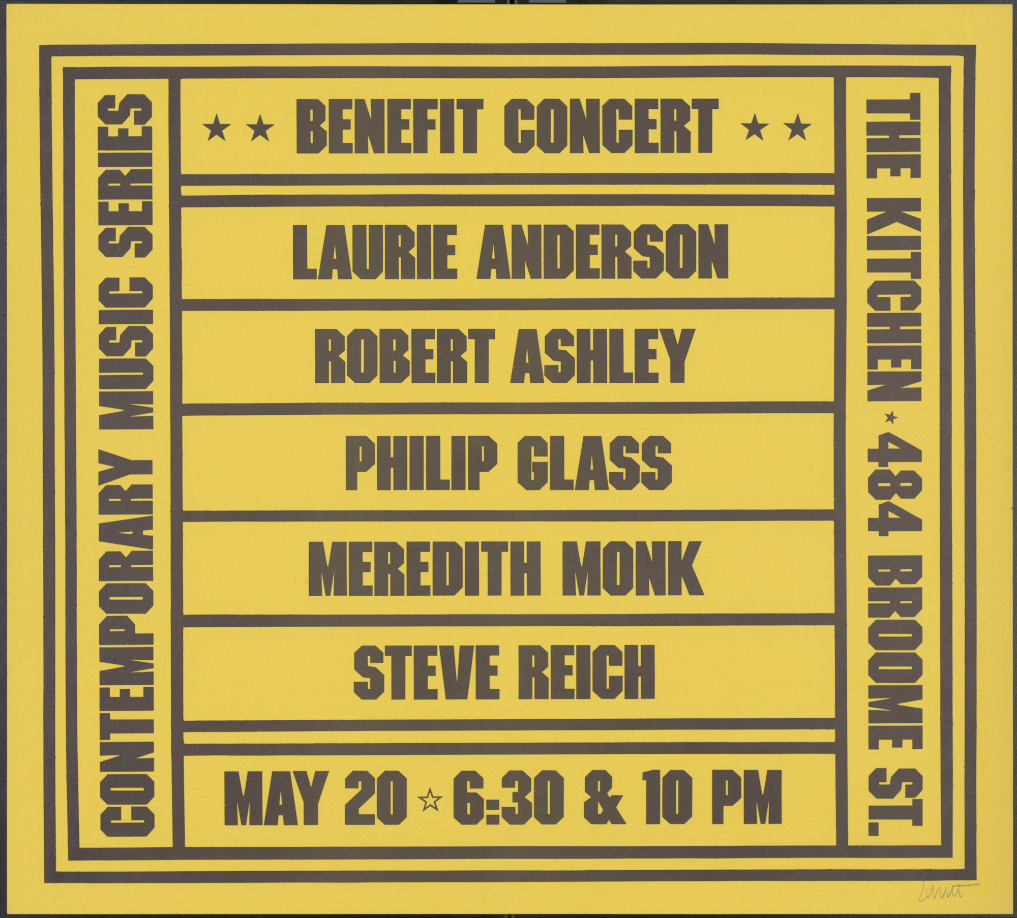 Limited Edition Poster designed by Sol Lewitt. There are 4 copies on a darker yellow, heavier stock paper and 4 copies on a lighter color paper. There are two copies of each weight that are signed by Meredith Monk and Philip Glass. All copies are signed by Sol Lewitt. Design by Sol Lewitt.