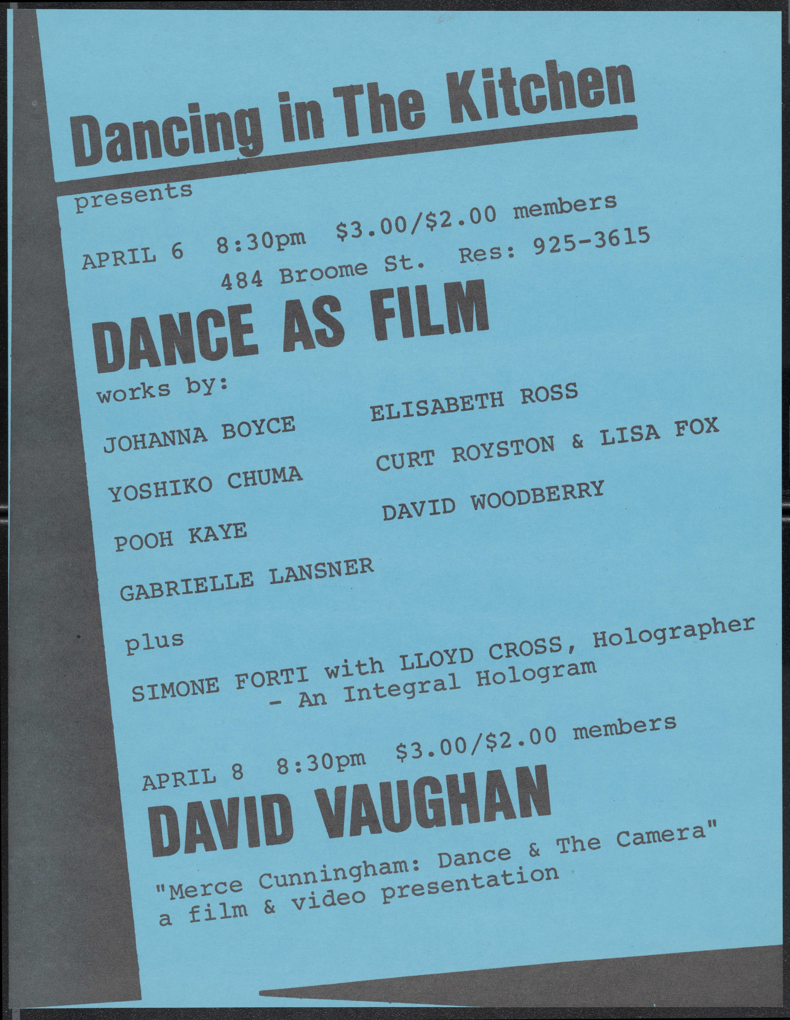 April 6, 8:30pm. Dance as Film, works by: Johanna Boyce, Yoshiko Chuma, Pooh Kaye, Gabrielle Lansner, Elizabeth Ross, Curt Royston & Lisa Fox, David Woodberry, plus Simone Forti with Lloyd Cross, Holographer - An Integral Hologram. April 8 8:30pm David Vaughan: "Merce Cunningham: Dance & The Camera‚" a film & video presentation.