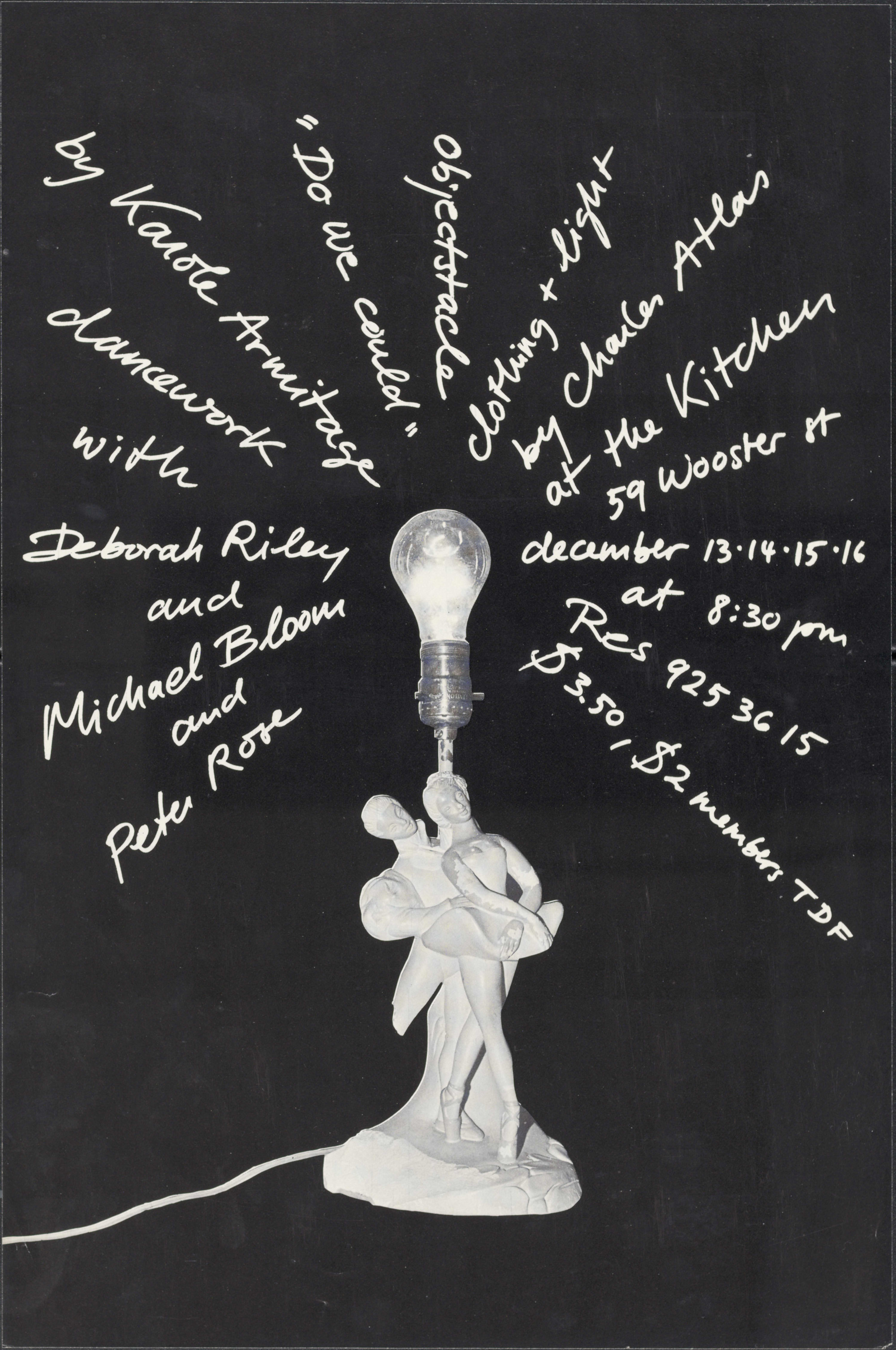 Do We Could, performed at The Kitchen in 1979, was a trio of dances choreographed by Karole Armitage and performed by Michael Bloom, Deborah Riley, and Armitage. The clothes and lighting for this event were designed by Charles Atlas. For Do We Could, Armitage separated each work into two scenes: in the first half, the dancers alternated their speeds between slow and rapid motion; in the second half, the dancers would perform at a normal speed but in the same spot for the entire scene. Do We Could marks Armitage's first performance at The Kitchen. At the time of this particular performance, Armitage was a member of the Merce Cunningham Dance Company and would later go on to founding her own company, Armitage Gone! Dance.