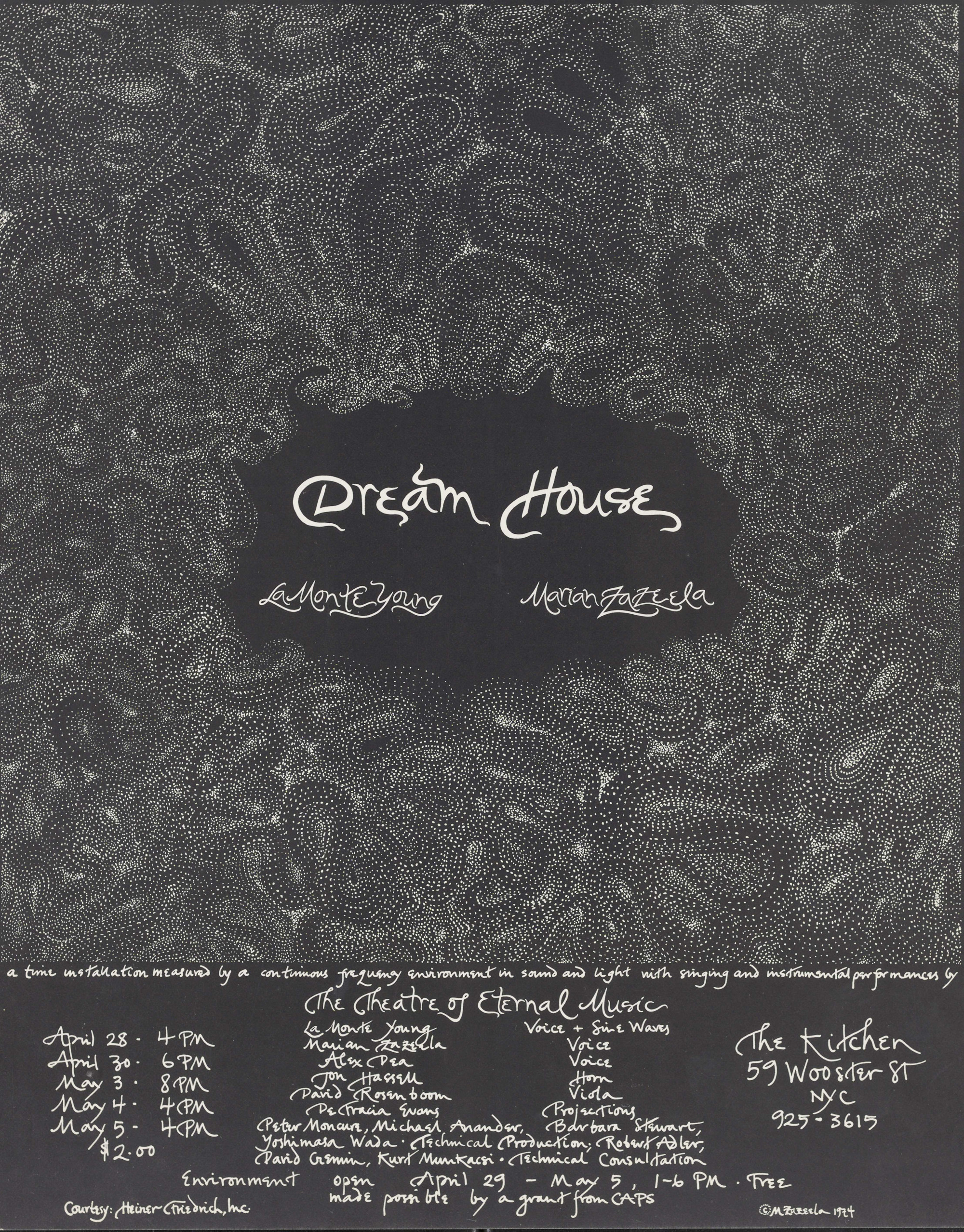 Dream House: a time installation measured by a continuous frequency environment in sound and light with singing and isntrumental performances by La Monte Young, Marian Zazeela, Alex Dea, Jon Hassell, David Rosenboom, and more.