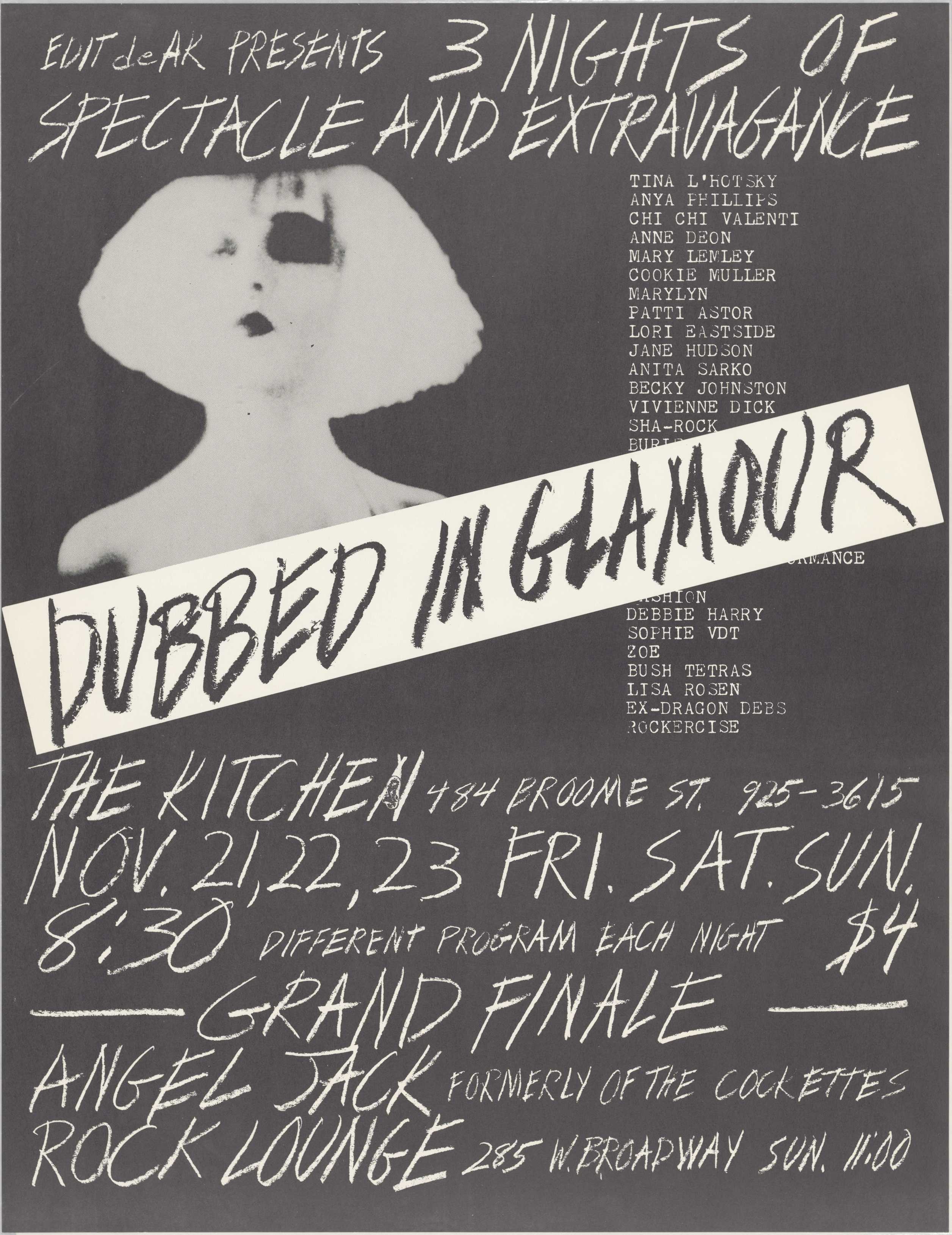 Edit DeAk Presents 3 Nights of Spectacle And Extravagance: "Dubbed in Glamour", A Different Program Each Night. Featuring: Tina L'Hotsky, Anya Phillips, Chi Chi Valenti, Anne Deon, Mary Lemley, Cookie Muller, Marylyn, Patti Astor, Lori Eastside, Jane Hudson, Anita Sarko, Becky Johnston, Vivienne Dick, Sha-Rock, Debbie Harry, Sophie VDT, Zoe, Bush Tetras, Lisa Rosen, Ex-Dragon Debs, Rockercise.