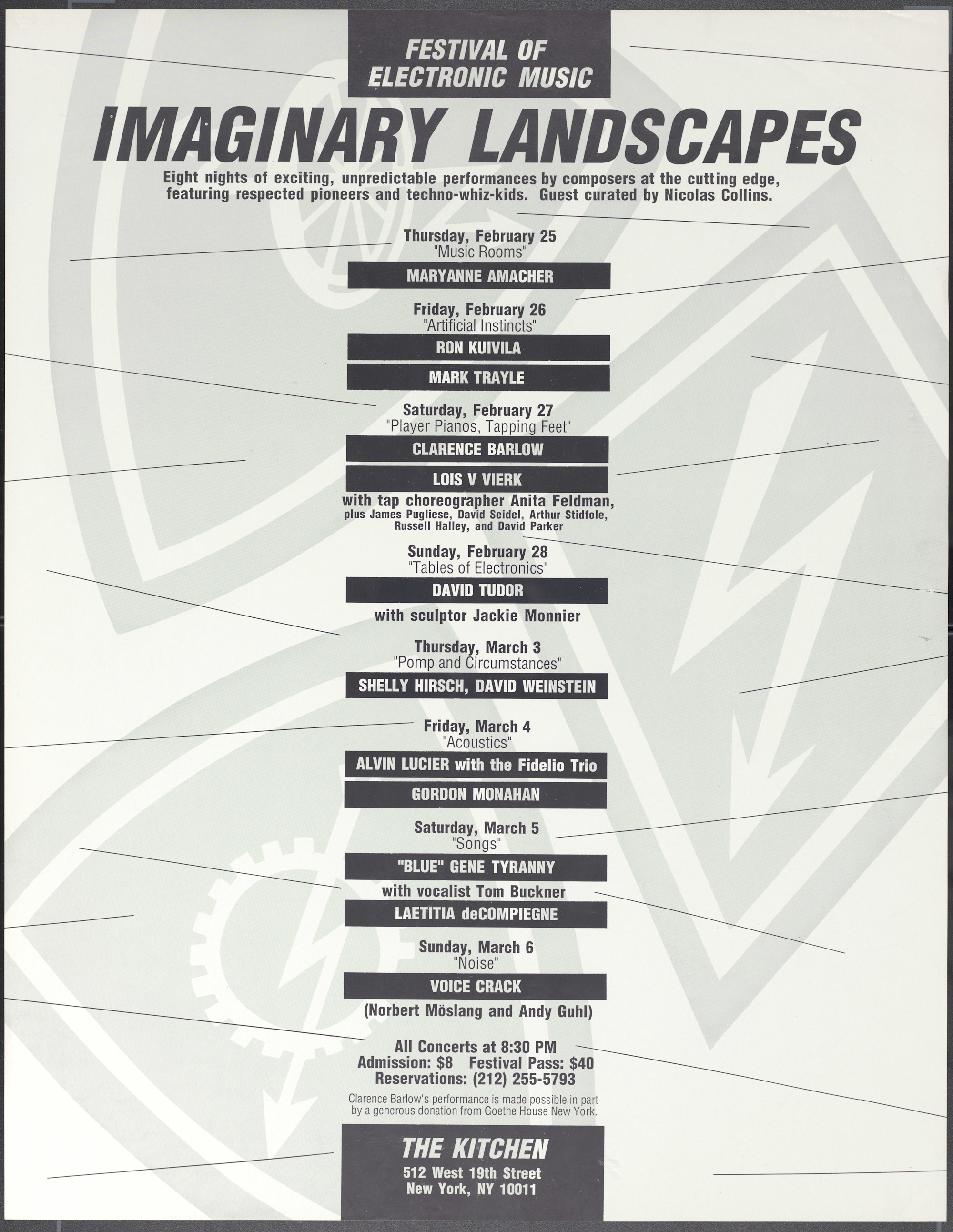 Festival of Electronic Music: Imaginary Landscapes; Eight nights of exciting, unpredictable performances by composers at the cutting edge, featuring respected pioneers and techno-whiz-kids. Guest curated by Nicolas Collins. Thursday, February 25: "Music Rooms" Maryanne Amacher. Friday, February 26 "Artificial Instincts" Ron Kuivila, Mark Trayle. Saturday, February 27 "Player Pianos, Tapping Feet" Clarence Barlow, Lois V Vierk with tap choreographer Anita Feldman, plus James Pugliese, David Seidel, Arthur Stidfole, Russell Halley, and David Parker. Sunday, February 28 "Tables of Electronics" David Tudor with sculptor Jackie Monnier. Thursday, March 3 "Pomp and Circumstances" Shelly Hirsch, David Weinstein. Friday, March 4 "Alvin Lucier with the Fidelio Trio, Gordon Monahan. Saturday, March 5 "Songs" "Blue" Gene Tyranny with vocalist Tim Buckner, Laetitia deCompiegne. Sunday, March 6 "Noise" Voice Crack (Norbert Mösland and Andy Guhl). All concerts at 8:30PM, Admission: $8 Festival Pass: $40. Clarence Barlow's performance is made possible in part by a donation from Goethe House New York.