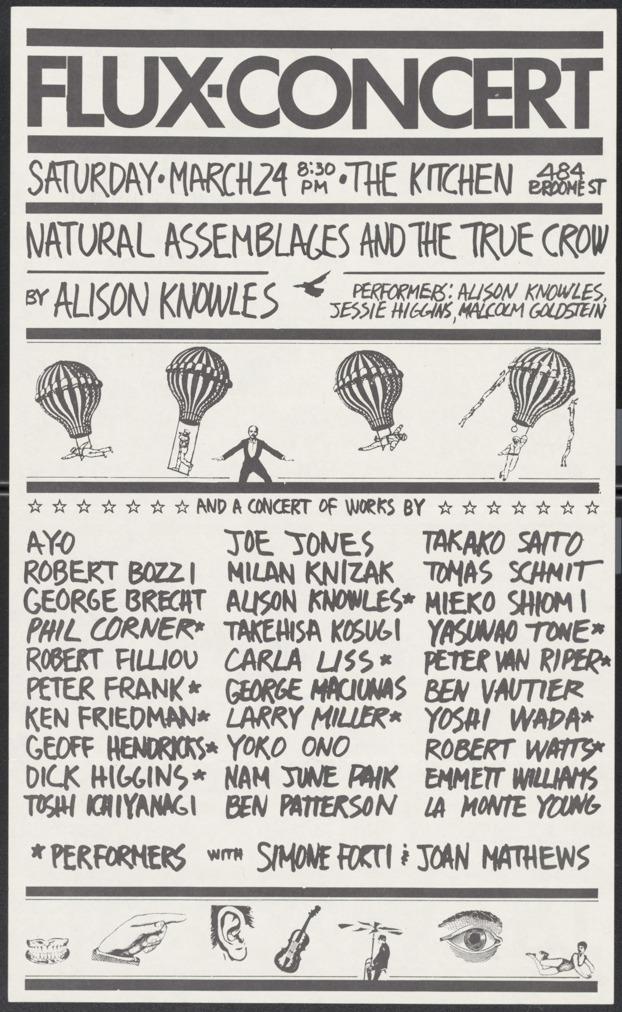 Flux-Concert at The Kitchen. Natural Assemblages and The True Crow by Alison Knowles. Performers: Alison Knowles, Jessie Higgins, Malcolm Goldstein. And a concert of works by Alison Knowles, Jessie Higgins, Malcolm Goldstein, Ay-o, Robert Bozzi, George Brecht, Phil Corner, Robert Filliou, Peter Frank, Ken Friedman, Geoff Hendricks, Dick Higgins, Toshi Kaiyanagi, Joe Jones, Milan Knizak, Takehisa Kosugi, Carla Liss, George Maciunas, Larry Miller, Yoko Ono, Nam June Paik, Ben Patterson, Takako Saito, Tomas Schmit, Mieko Shiomi, Yasunao Tone, Peter Van Riper, Ben Vautier, Yoshi Wada, Robert Watts, Emmett Williams, La Monte Young, Simone Forti, Joan Matthews