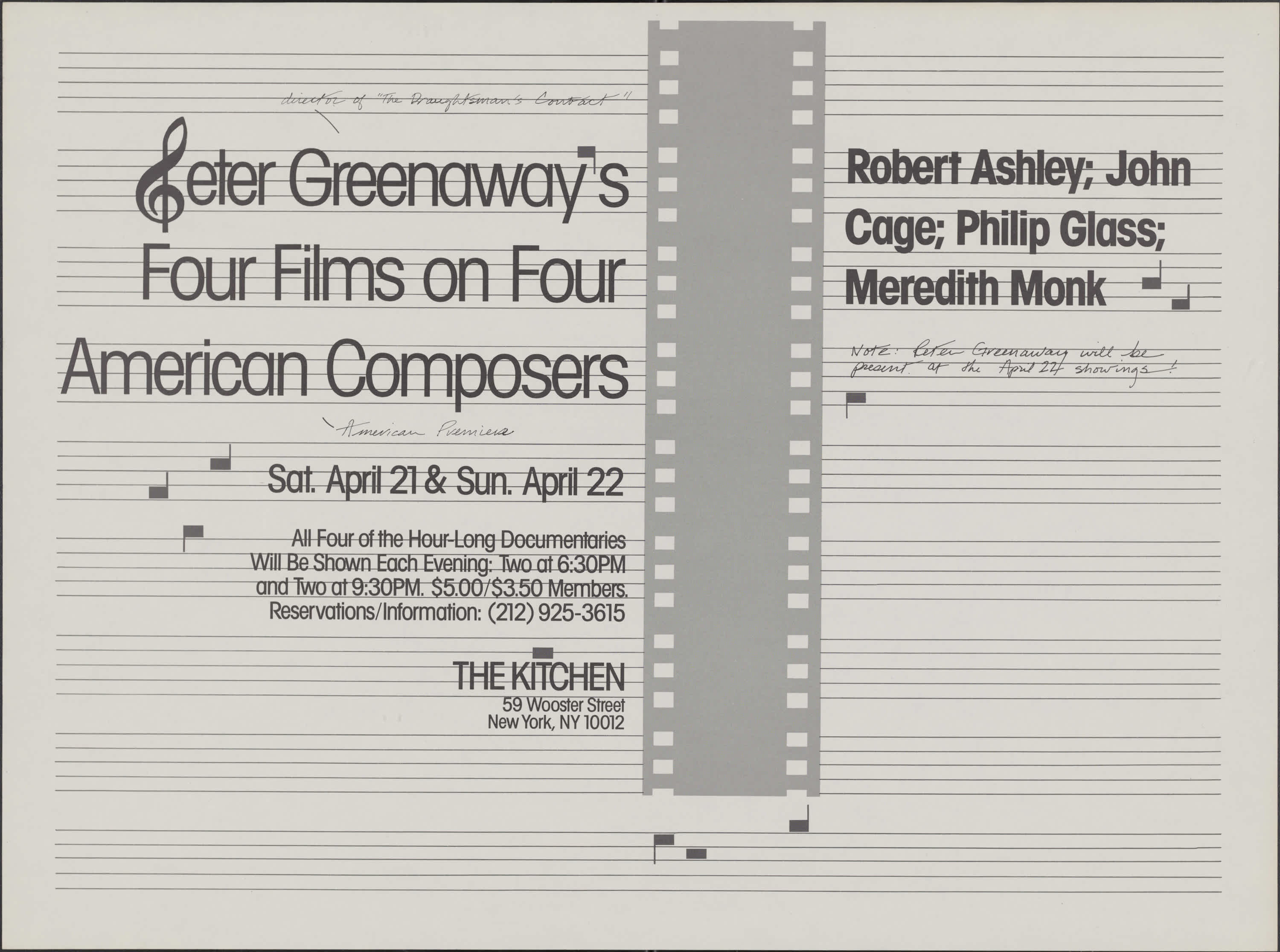 On April 21–22, 1984, Peter Greenway organized Four Films on Four American Composers, screenings of films on Robert Ashley, John Cage, Philip Glass, Meredith Monk, at The Kitchen. The series of films was produced by Revel Guest for broadcasting on Britain's Channel 4.