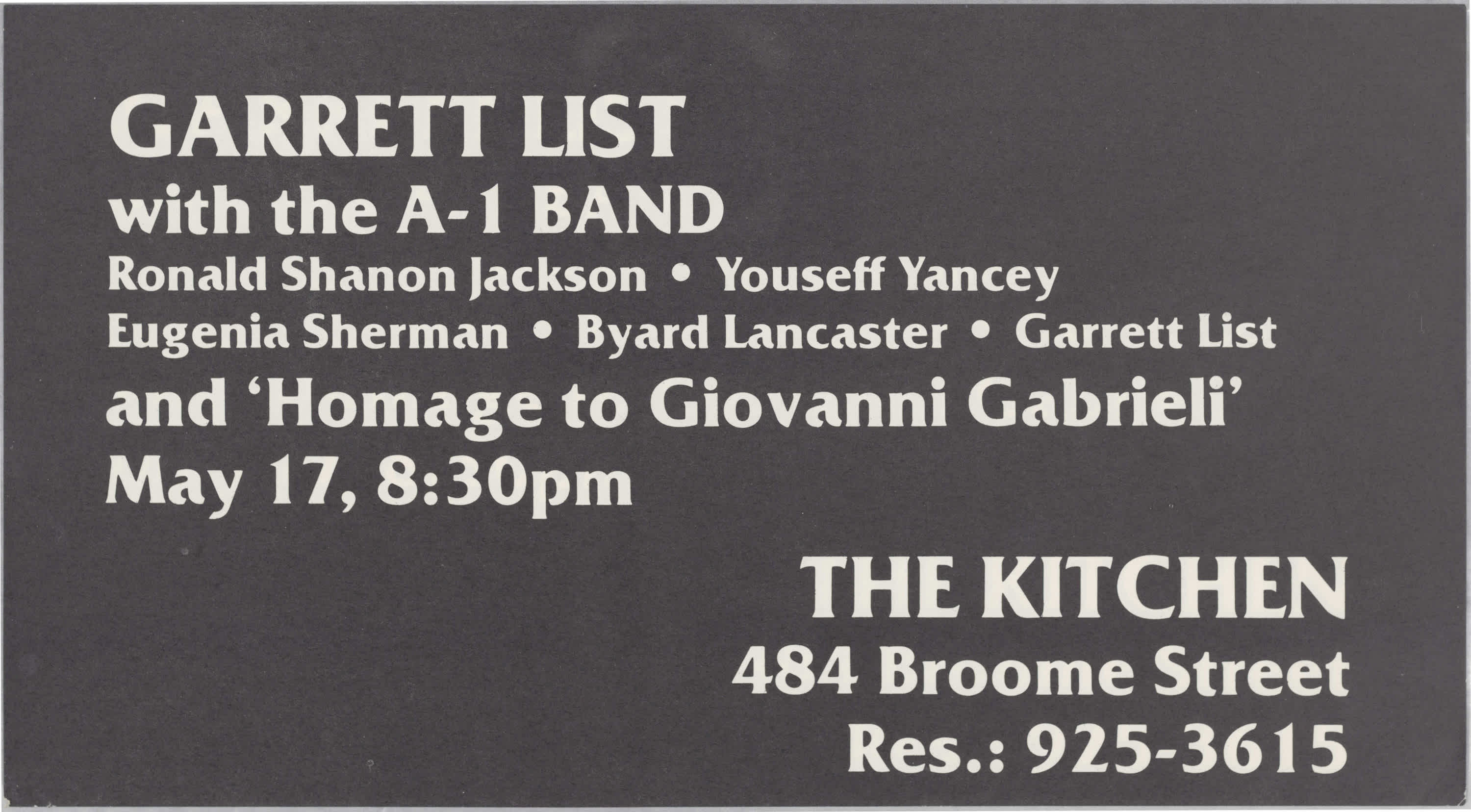 Ronald Shannon Jackson, Youseff Yancey, Eugenia Sherman, Byard Lancaster, Garrett List, and 'Homage to Giovanni Gabrieli' May 17, 8:30pm