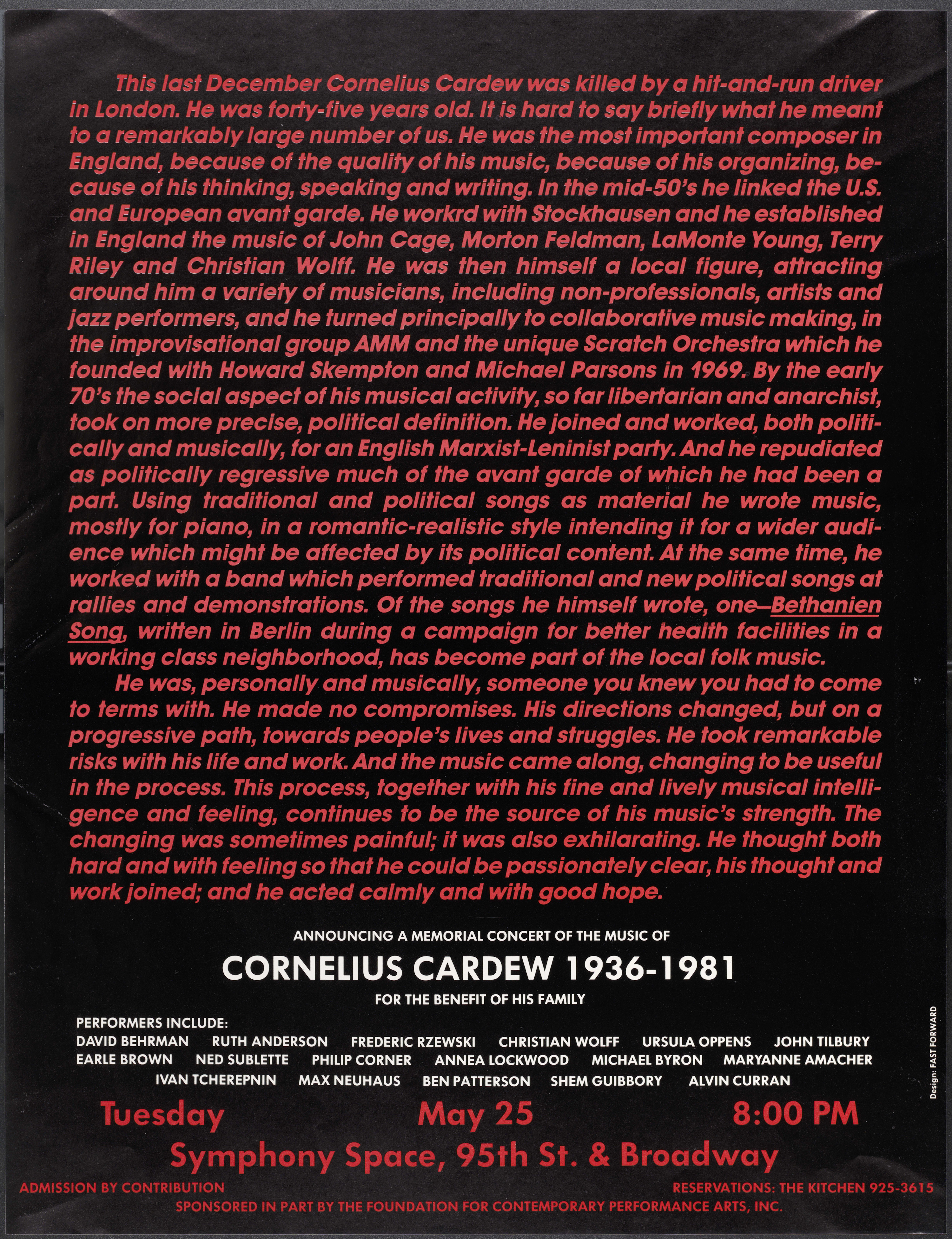 Performers Include: David Behrman, Ruth Anderson, Frederic Rzewski, Christian Wolff, Ursula Oppens, John Tilbury, Earle Brown, Ned Sublette, Philip Corner, Anne Lockwood, Michael Byron, Maryanne Amacher, Ivan Tcherepnin, Max Neuhaus, Ben Patterson, Shem Guibbory, Alvin Curran. Tuesday May 25 8:00PM. Symphony Space, 95th St. & Broadway. Admission by Contribution. Sponsored in part by the Foundation for Contemporary Performance Arts, Inc.
