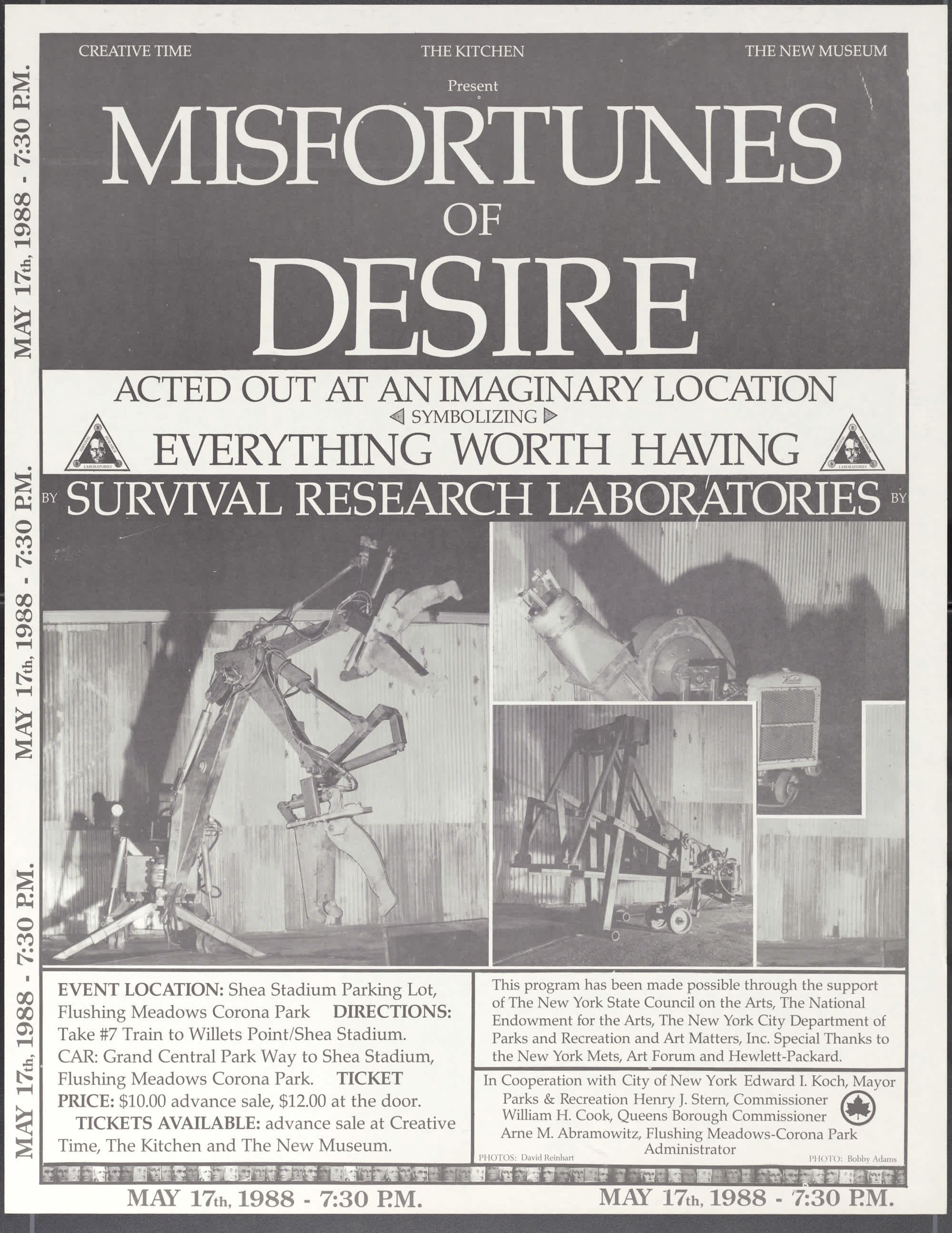 Creative Time, The Kitchen, The New Museum Present Misfortunes of Desire, Acted out at an imaginary location symbolizing everything worth having. By Survival Research Laboratories