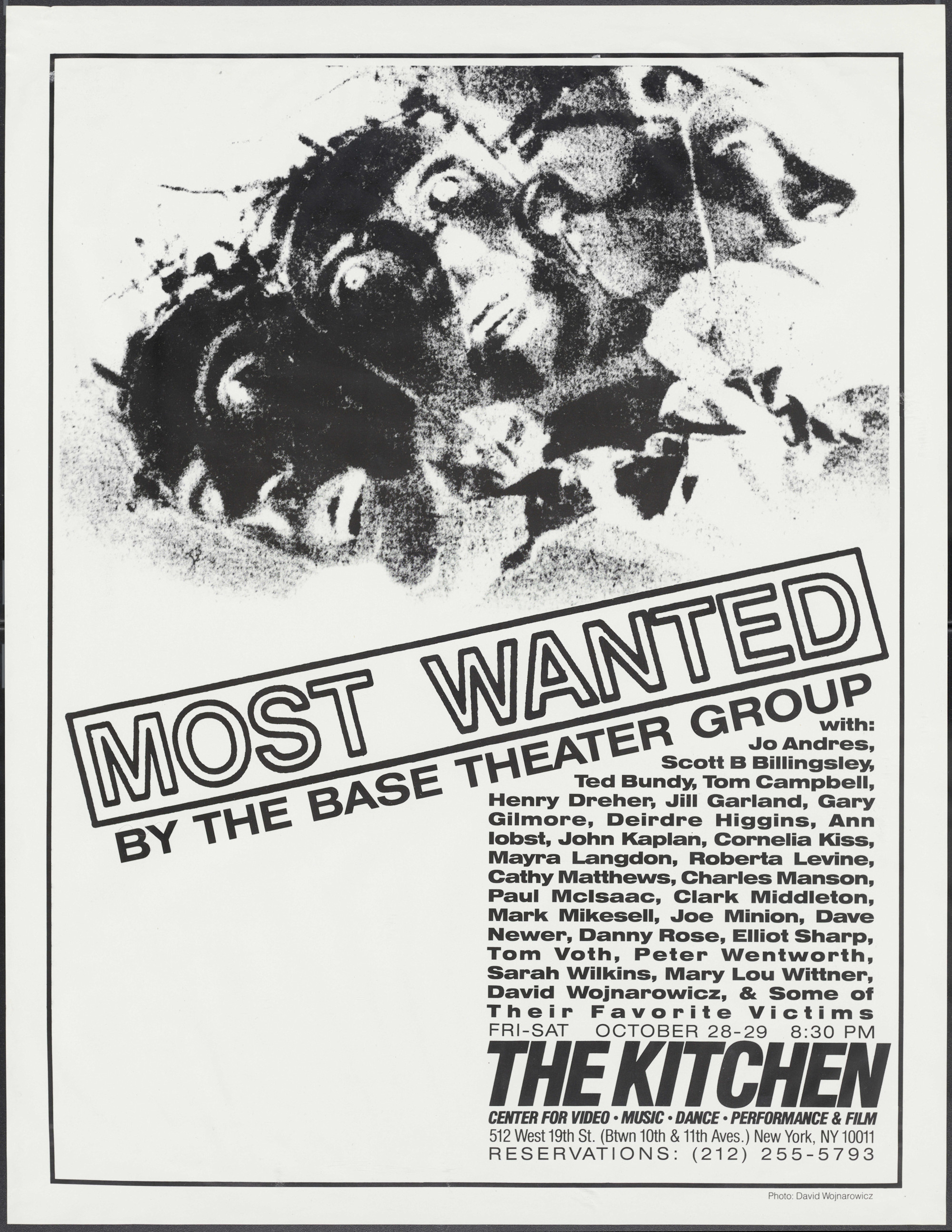 Most Wanted by The Base Theater Group With: Jo Andres, Scott B. Billingsley, Ted Bundy, Tom Campbell, Henry Dreher, Jill Garland, Gary Iobst, John Kaplan, Cornelia Kiss, Mayra Langdon, Roberta Levine, Cathy Matthews, Charles Manson, Paul McIsaac, Clark Middleton, Mark Mikesell, Joe Minion, Dave Newer, Danny Rose, Elliot Sharp, Tom Voth, Peter Wentworth, Sarah Wilkins, Mary Lou Wittner, David Wojnarowicz, + Some of Their Favorite Victims. Fri-Sat October 28-29 8:30 PM