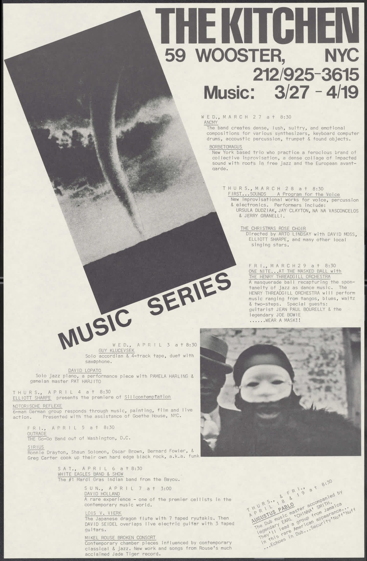 Wed., March 27 at 8:30: Anomy: The band creates dense, lush, sultry, and emotional compositions for various synthesizers, keyboard computer drums, acoustic percussion, trumpet & found objects. Borbetomagus: New York based trio who practice a ferocious brand of collective improvisation, a dense collage of impacted sound with roots in free jazz and the European avant-garde. Thurs., March 28 at 8:30: First...Sounds: A Program for the Voice: New improvisational works for voice, percussion & electronics. Performers include Ursula Dudziak, Jay Clayton, Na Na Vasconcelos & Jerry Granelli. The Christmas Rose Choir: Directed by Arto Lindsay with David Moss, Elliott Sharpe, and many other local singing stars. Fri., March 29 at 8:30: One Nite...At the Masked Ball with The Henry Threadgill Orchestra: A masquerade ball recapturing the spontaneity of jazz as dance music. The Henry Threadgill Orchestra will perform music ranging from tangos, blues, waltz, & two-steps. Special guests: guitarist Jean Paul Bourelly & the legendary Joe Bowie......WEAR A MASK!! Wed., April 3 at 8:30: Guy Klucevsek: Solo accordian & 4-track tape, duet with saxophone. David Lopato: Solo jazz piano, a performance piece with Pamela Harling & gamelan master Pat Harjito. Thurs., April 4 at 8:30: Elliott Sharpe: presents the premiere of Silicontemptation. Notorische Reflexe: 6-man German group responds through music, painting, film and live action. Presented with the assistance of Goethe House, NYC. Fri., April 5 at 8:30: Outrage: THE Go-Go Band out of Washington D.C. Sirius: Ronnie Drayton, Shaun Solomon, Oscar Brown, Bernard Fowler, & Greg Carter cook up their own hard edge black rock, a.k.a. funk. Sat., April 6 at 8:30: White Eagles Band & Show: The #1 Mardi Gras Indian band from the Bayou. Sun., April 7 at 3:00: David Holland: A rare experience - one of the premier cellists in the contemporary. music world. Lois V. Vierk: The Japanese dragon flute with 7 taped ryutakis. Then David Seidel overlaps live electric guitar with 3 taped guitars. Mikel Rouse Broken Consort: Contemporary chamber pieces influenced by contemporary classical & jazz. New work and songs from Rouse's much acclaimed Jade Tiger recrod. Thurs., & Fri., April 18 & 19 at 8:30: Augustus Pablo: The Dub music master accompanied by legendary Earl 'Chinna' Smith. They'll lead a group from Jamaica in this rara American appearance......Echoes in Dub...Security'Nuff'Nuff