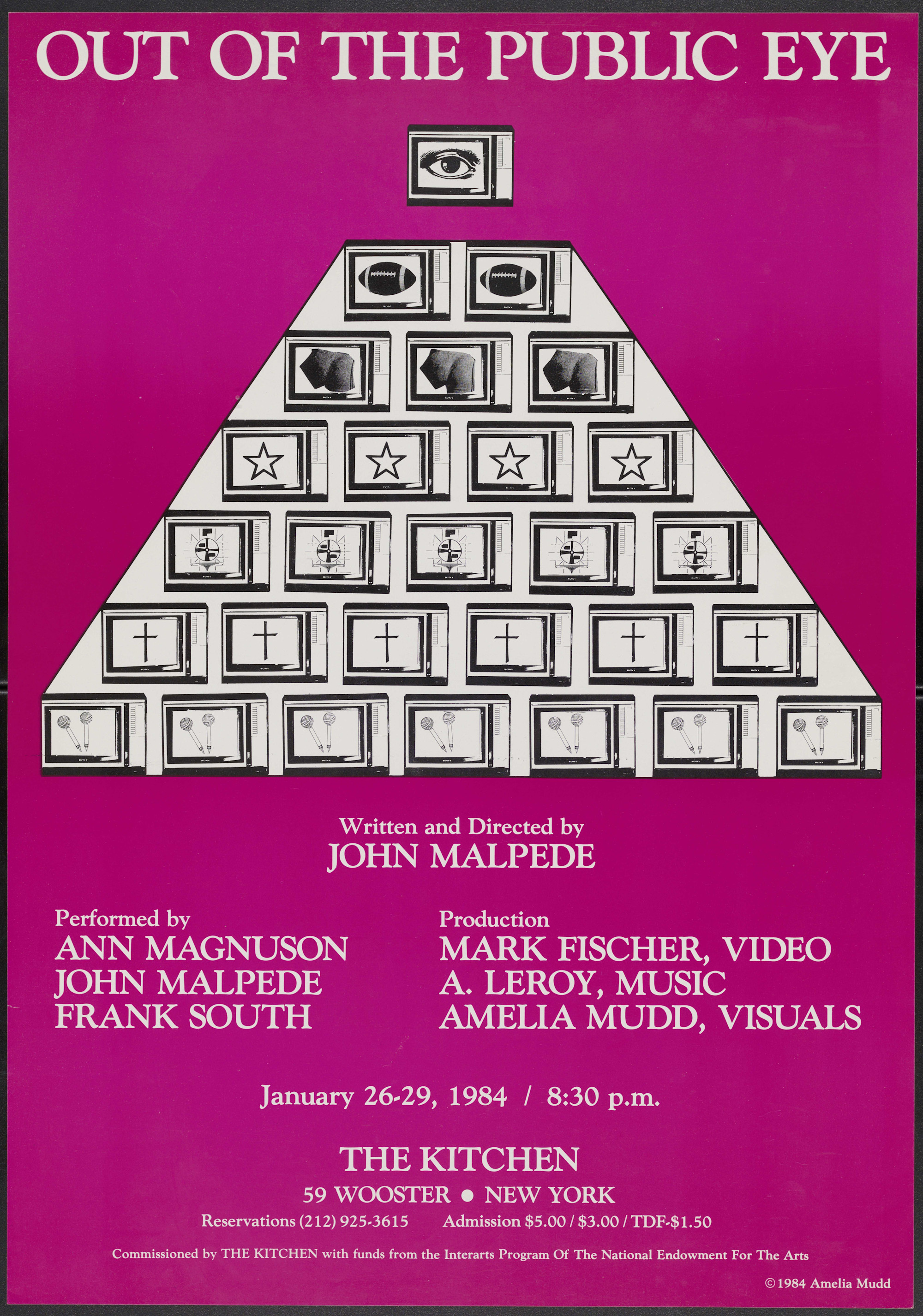 On January 26–29, 1984, Out of the Public Eye, a performance by John Malpede took place at The Kitchen. Performers included Ann Magnuson, Frank South and John Malpede, with video by Mark Fisher and music by A. Leroy.