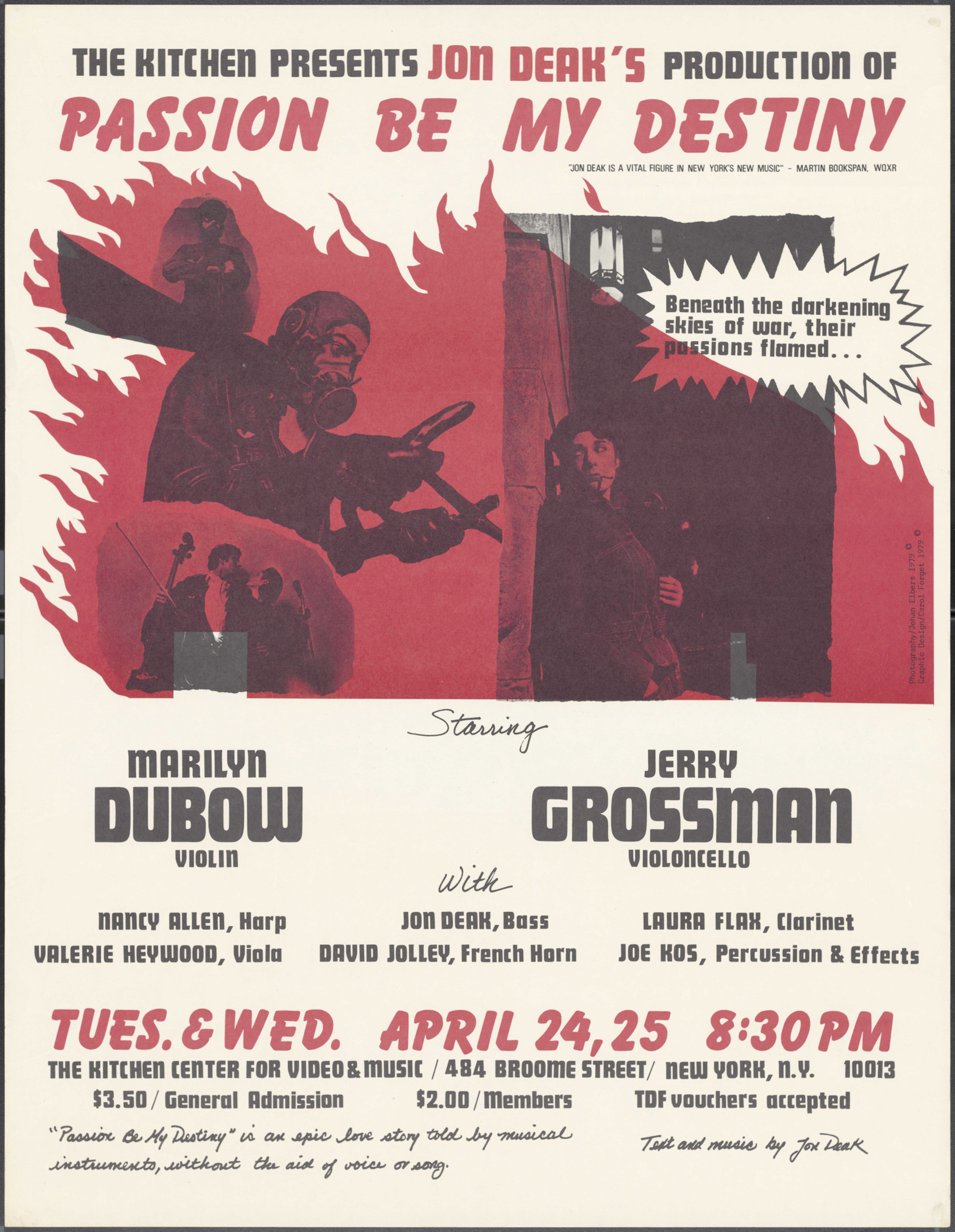 The Kitchen Presents Jon Deak's Production of "Passion Be My Destiny" Starring Marilyn Dubow (violin) and Jerry Grossman (violoncello), with Nancy Allen (harp), Valerie Heywood (viola), Jon Deak (bass), David Jolley (french horn), Laura Flak (clarinet), Joe Kos (percussion and effects). "Passion Be My Destiny" is an epic love story told by musical instruments, without the aid of voice of song.