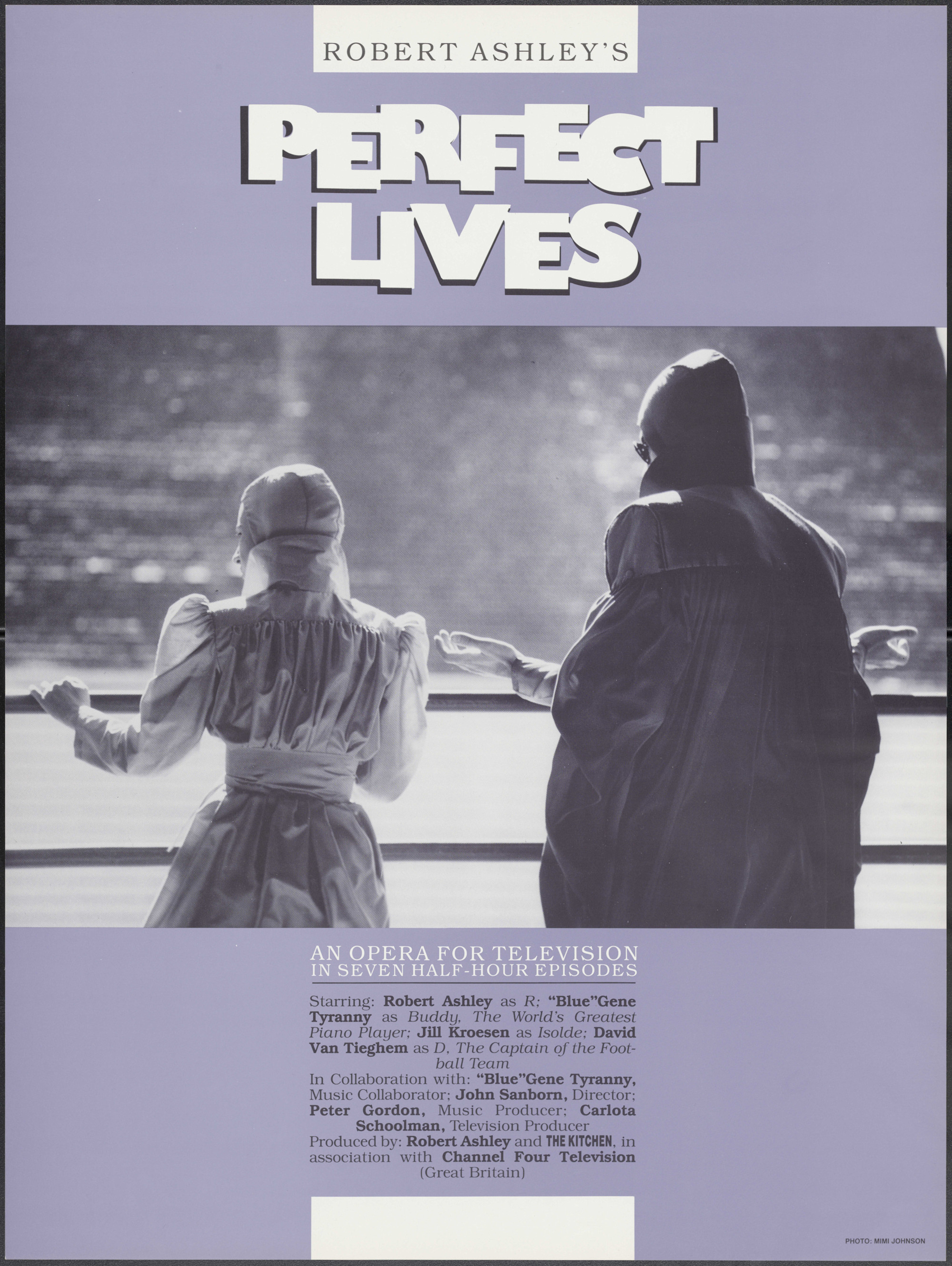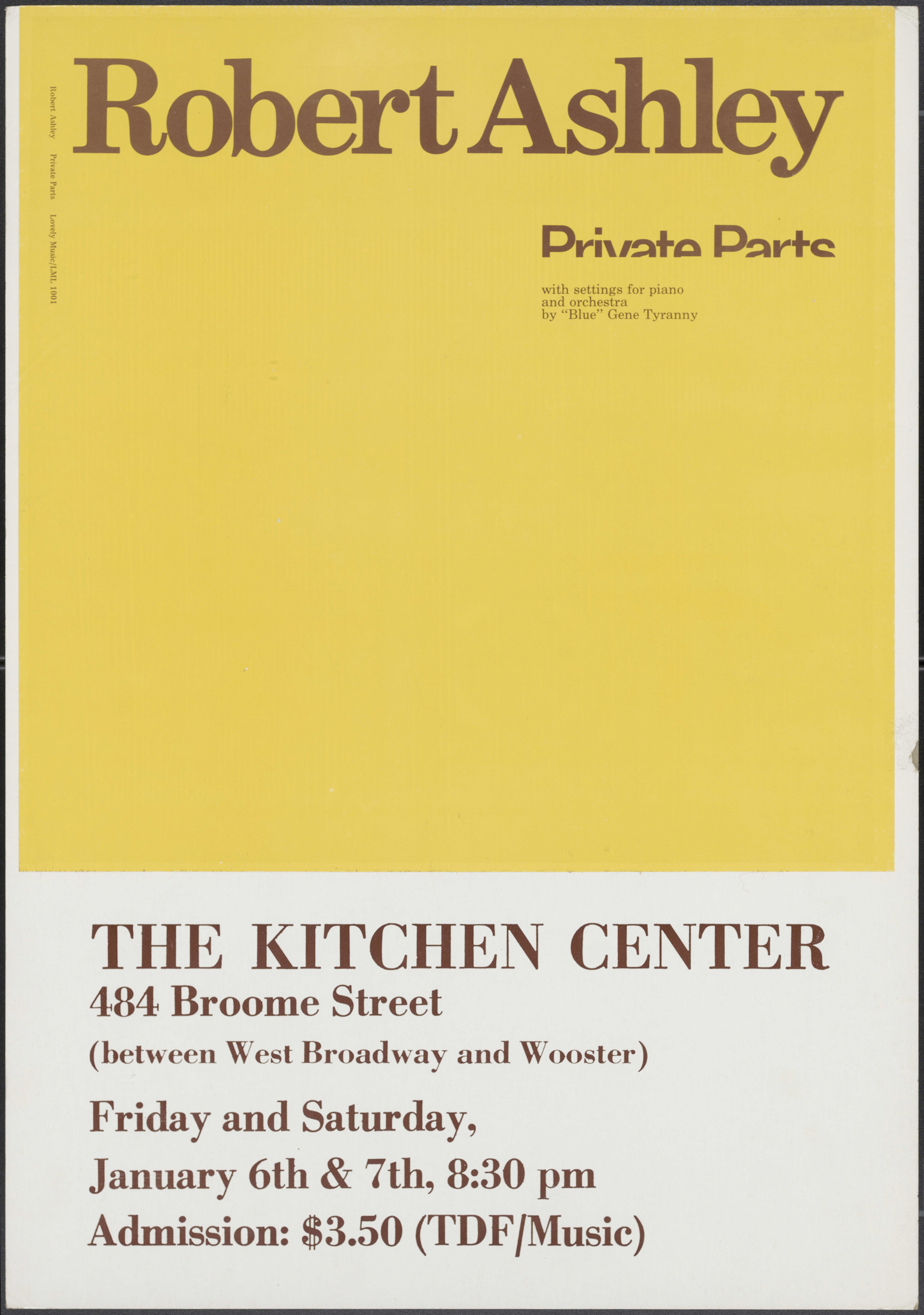 In 1978, Robert Ashley presented a work-in-progress, titled Private Parts, that would later be developed into Perfect Lives, the work for which he is perhaps best-known. It included a number of songs written by Ashley with accompaniment by “Blue” Gene Tyranny and Peter Gordon, along with a video installation by Jill Kroesen.