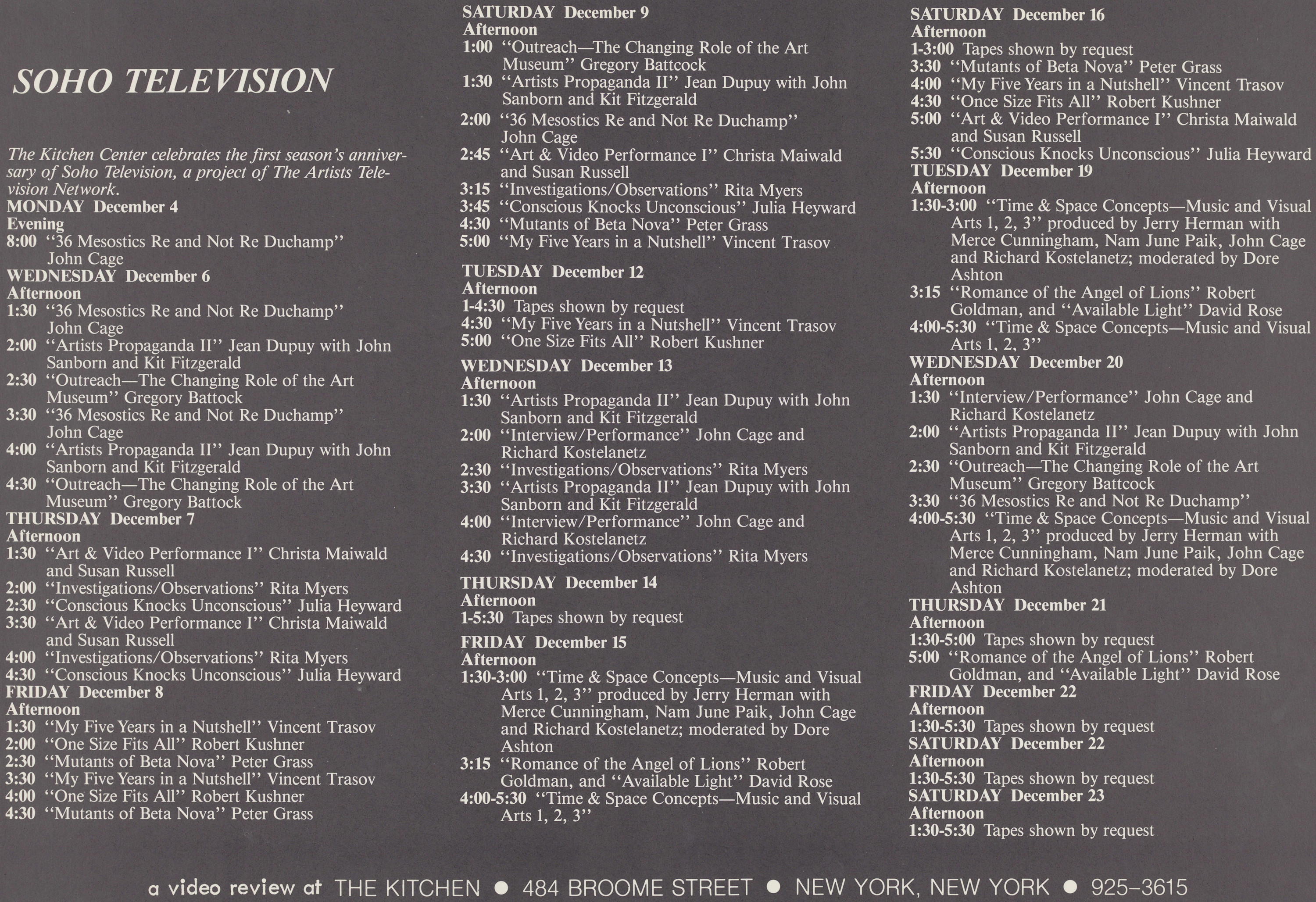 Soho Television: The Kitchen Center celebrates the first season's anniversary of Soho Television, a project of The Artist's Television Network. Program included John Cage, John Sanborn, Kit Fitzgerald, Julia Heyward, Jean Dupuy, Nam June Paik, and others.