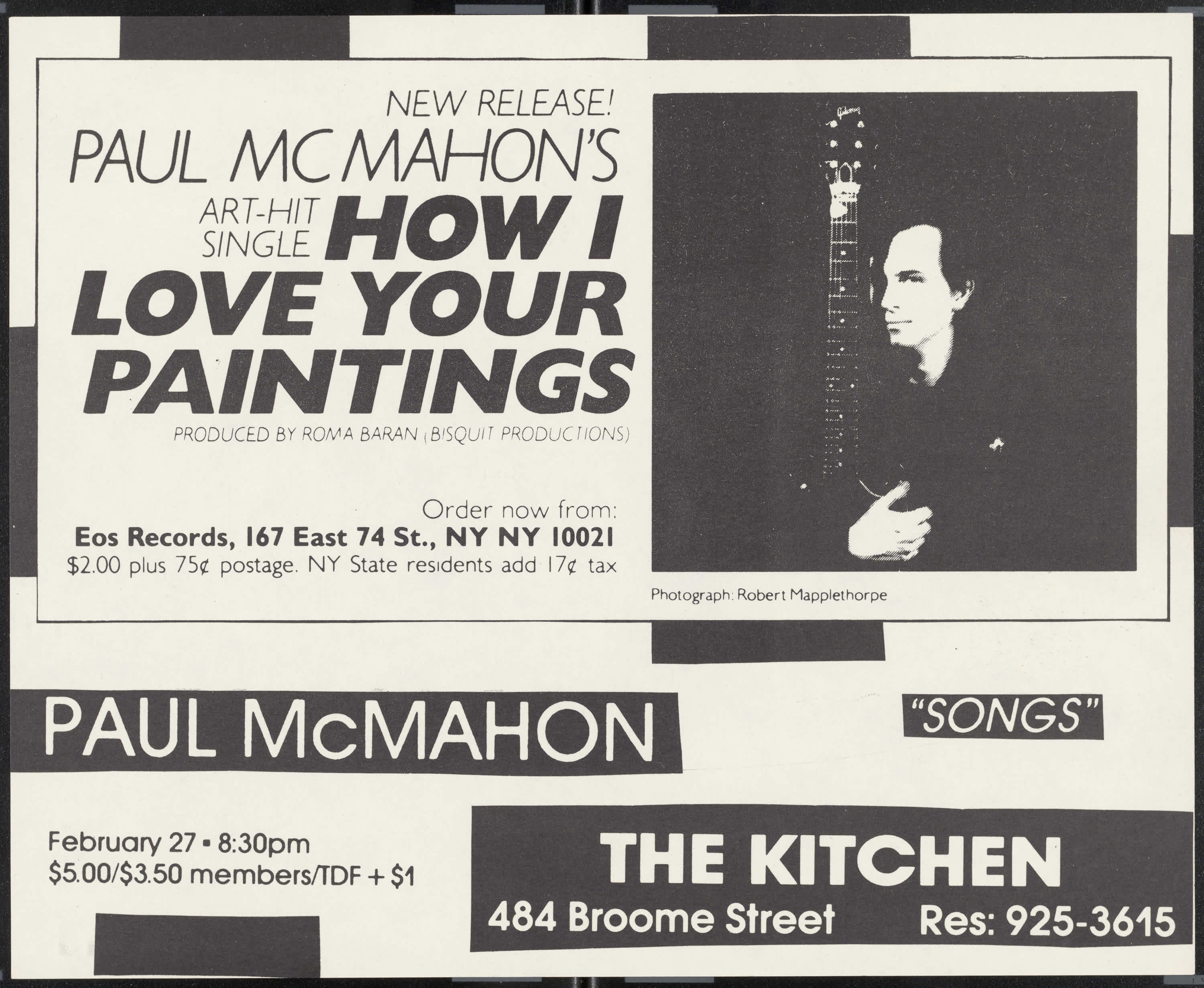 New Release! Paul McMahon's Art-Hit Single How I Love Your Paintings Produced by Roma Baran (Bisquit Productions). Order now from: Eos records, 167 East 74 St., NY NY 10021. $2.00 plus 75¢ postage. NY State residents add 17¢ tax. Photograph: Robert Mapplethorpe