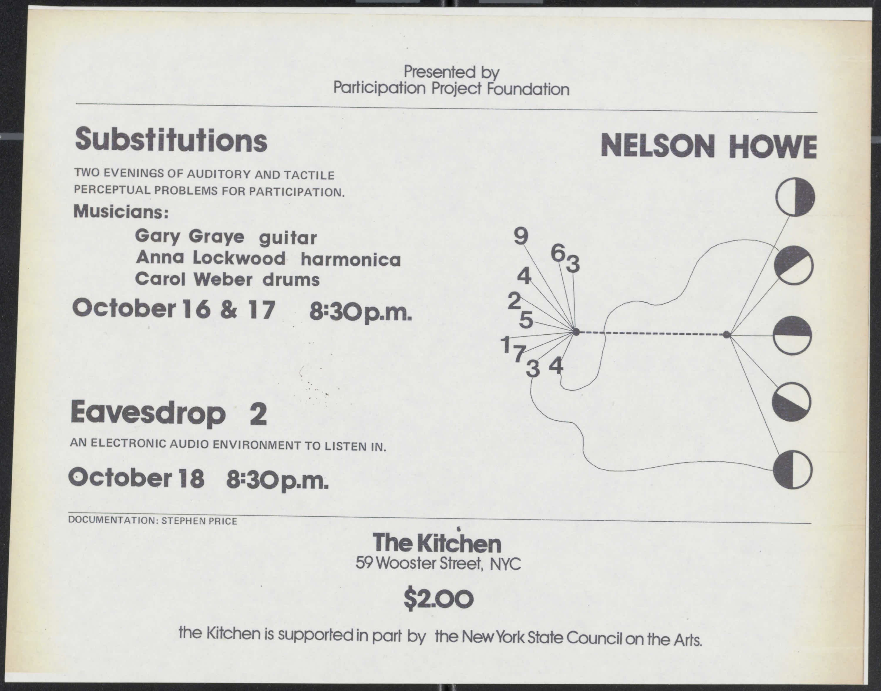 "Substitutions" featured musicians: Gary Graye, Anna Lockwood, and Carol Weber. On October 18th there was a piece called "Eavesdrop 2", an Electronic Audio Environment to Listen In. Presented by the Participation Project Foundation.