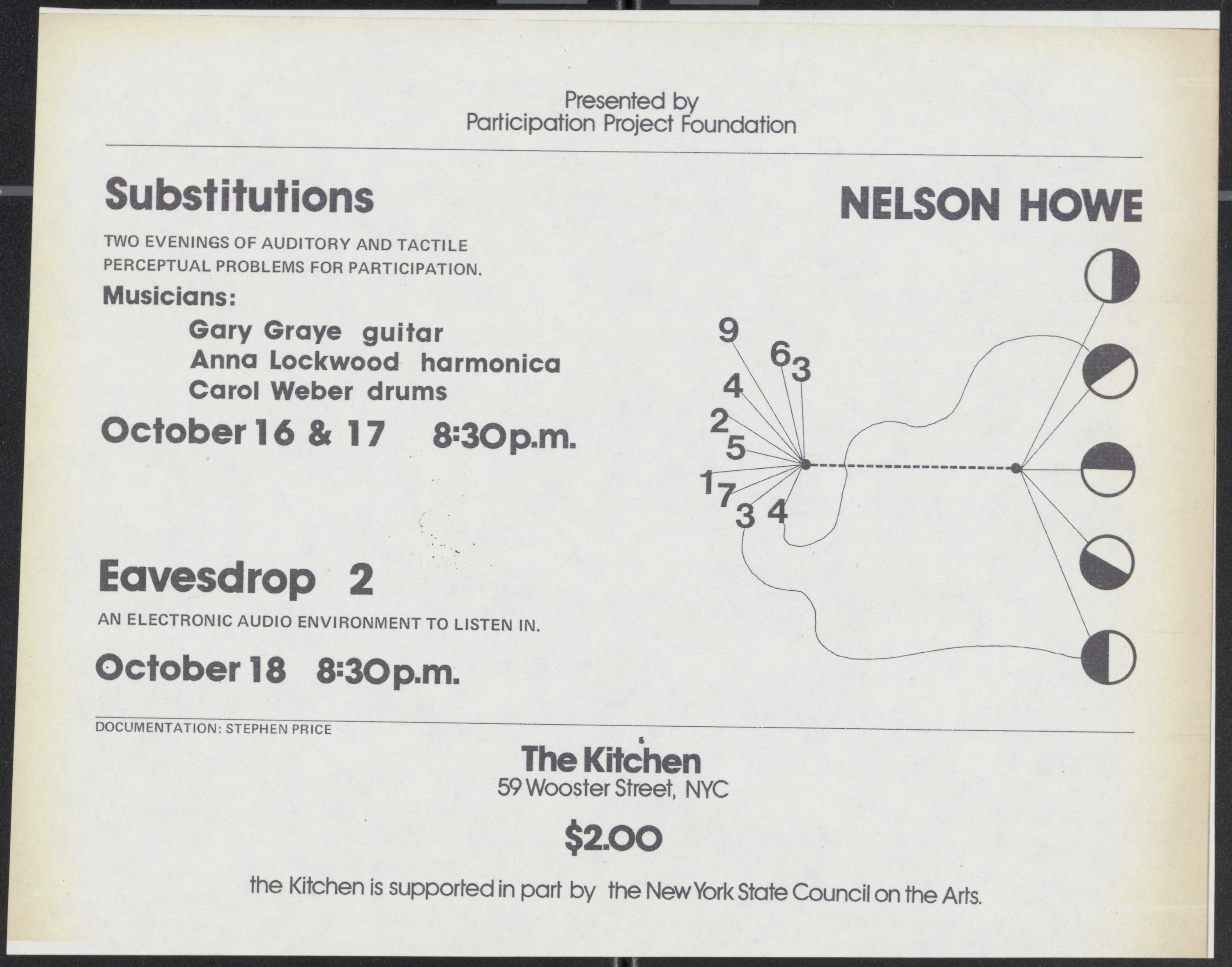 "Substitutions" featured musicians: Gary Graye, Anna Lockwood, and Carol Weber. On October 18th there was a piece called "Eavesdrop 2", an Electronic Audio Environment to Listen In. Presented by the Participation Project Foundation.