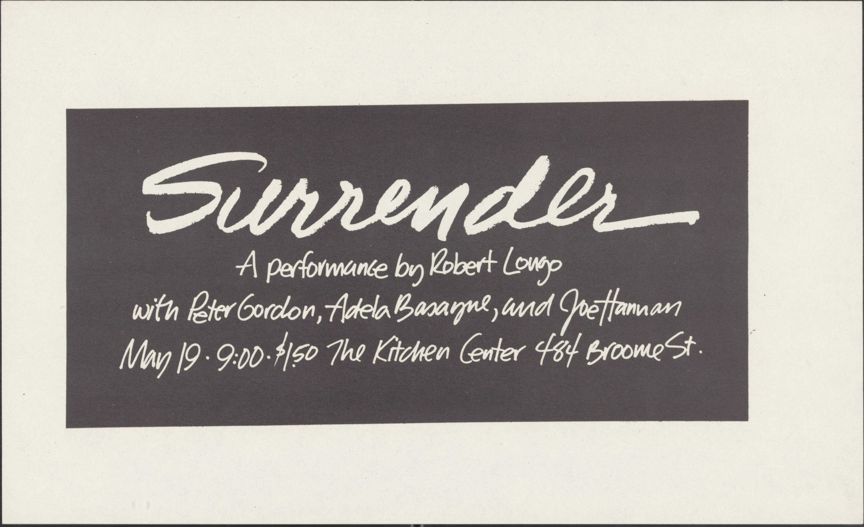 Robert Longo’s Surrender premiered at The Kitchen on May 19, 1979. A multimedia work, Surrender comprised a film as well as live music and performance. A saxophonist provided the soundtrack to the film, which depicts an unmoving Grecian statue of a young athlete. On the other side of the performance space, a young couple dressed in office clothes reminiscent of the 1950s embraced each other and proceeded to act out a rock-and-roll style dance in slow motion. Longo’s Surrender meditated on the interplay between the past and the present as well as movement and stillness in film, photography, and performance.
