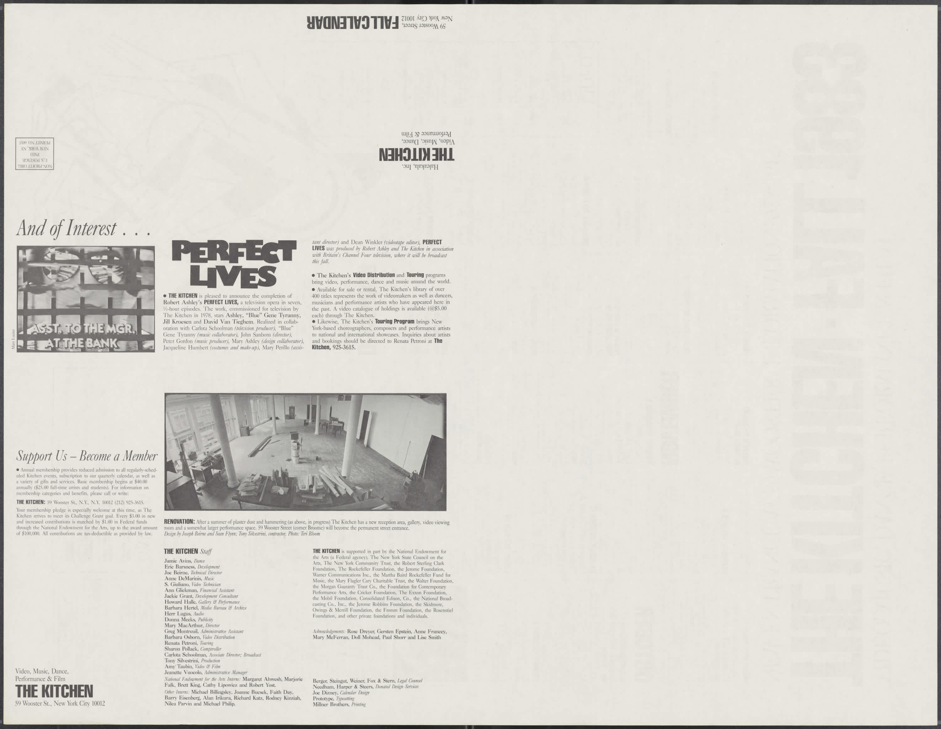 A calendar bursting with activity. This was one of the early peaks for The Kitchen. The calendar features Max Roach and Fab 5 Freddy, Steina and Woody Vasulka, Laura Mulvey and Peter Wollen, Peter Greenaway, Kiki Smith, Yoshiko Chuma, Joan Jonas and others.