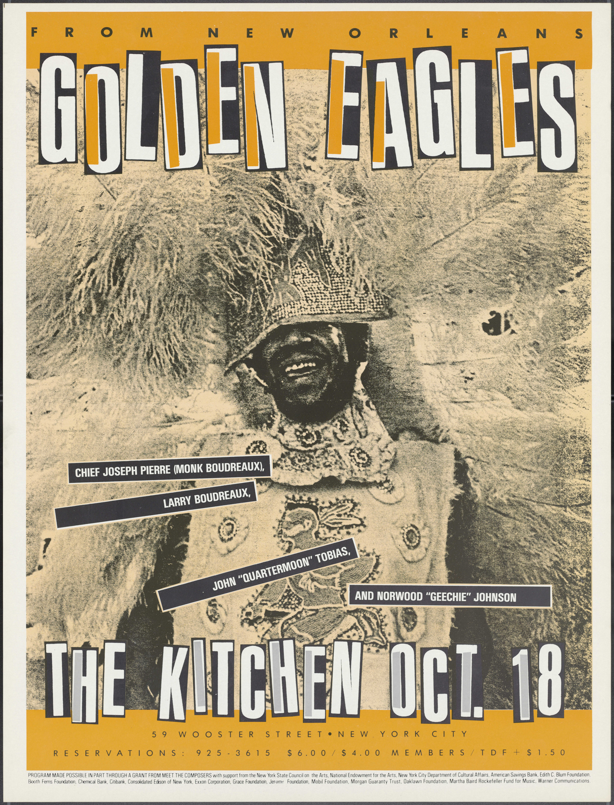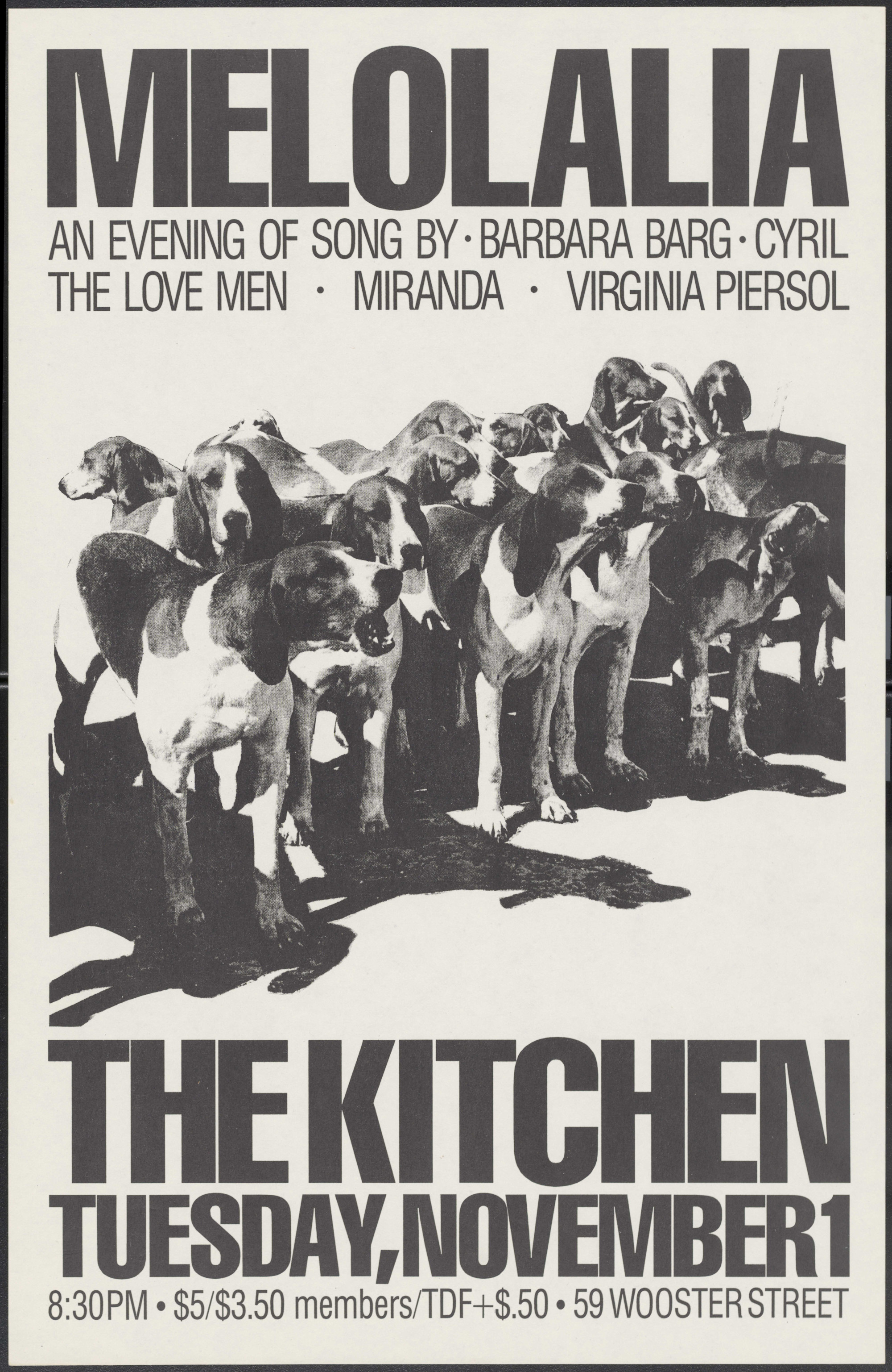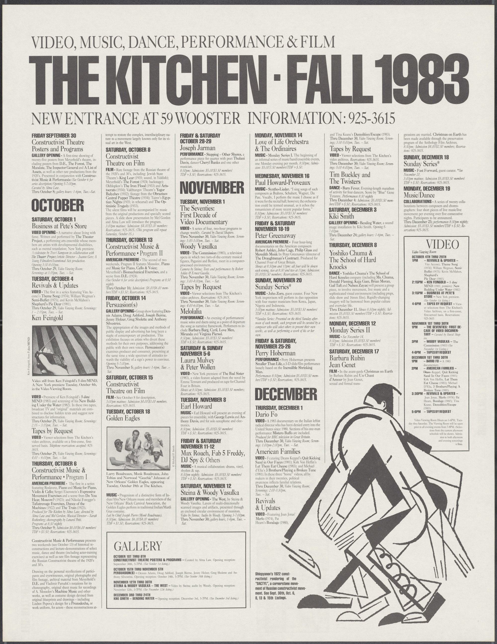 A calendar bursting with activity. This was one of the early peaks for The Kitchen. The calendar features Max Roach and Fab 5 Freddy, Steina and Woody Vasulka, Laura Mulvey and Peter Wollen, Peter Greenaway, Kiki Smith, Yoshiko Chuma, Joan Jonas and others.