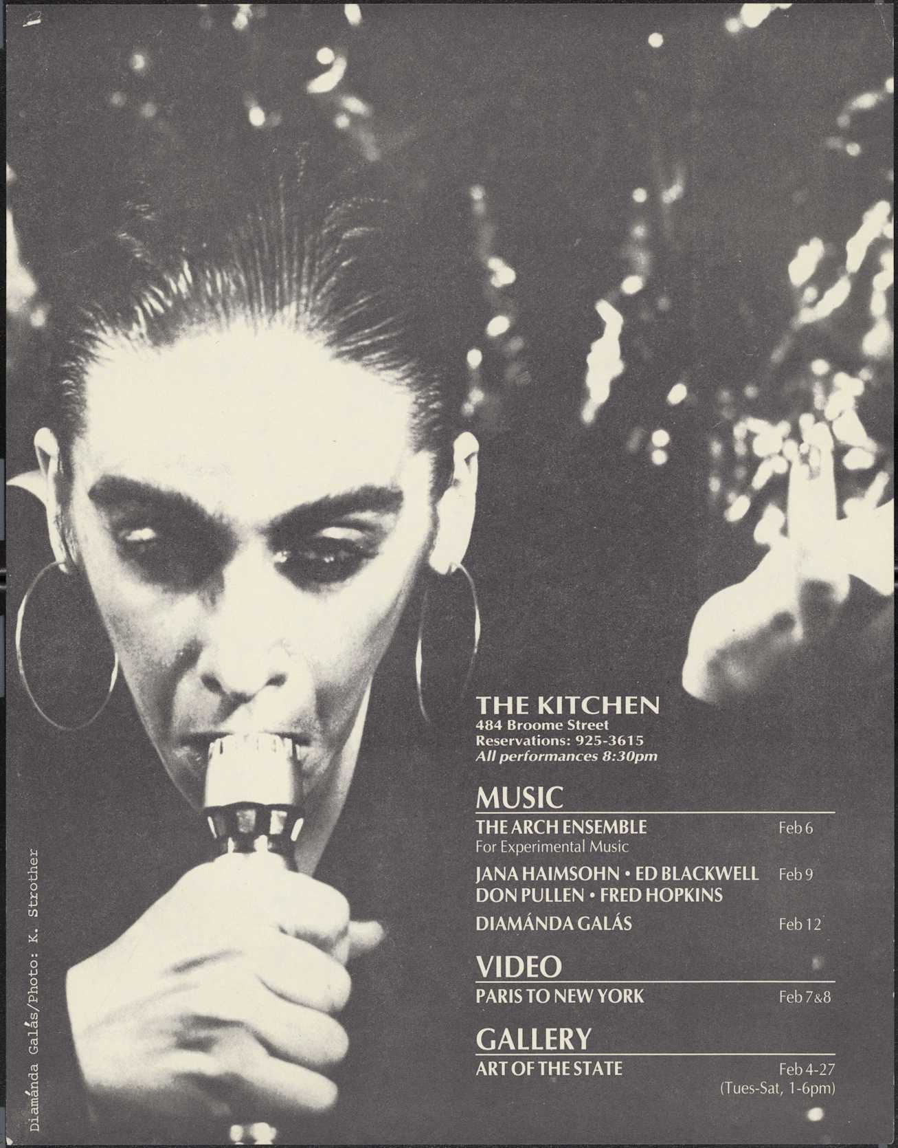 February 1982 Poster Calendar with a picture of Diamánda Galás by K. Strother. The month featured MUSIC programs with The Arch Ensemble, Jana Haimsohn and Ed Blackwell, Don Pullen and Fred Hopkins, and Diamánda Galás. There was a video program titled "Paris to New York" and the show "Art of the State" was in the gallery.