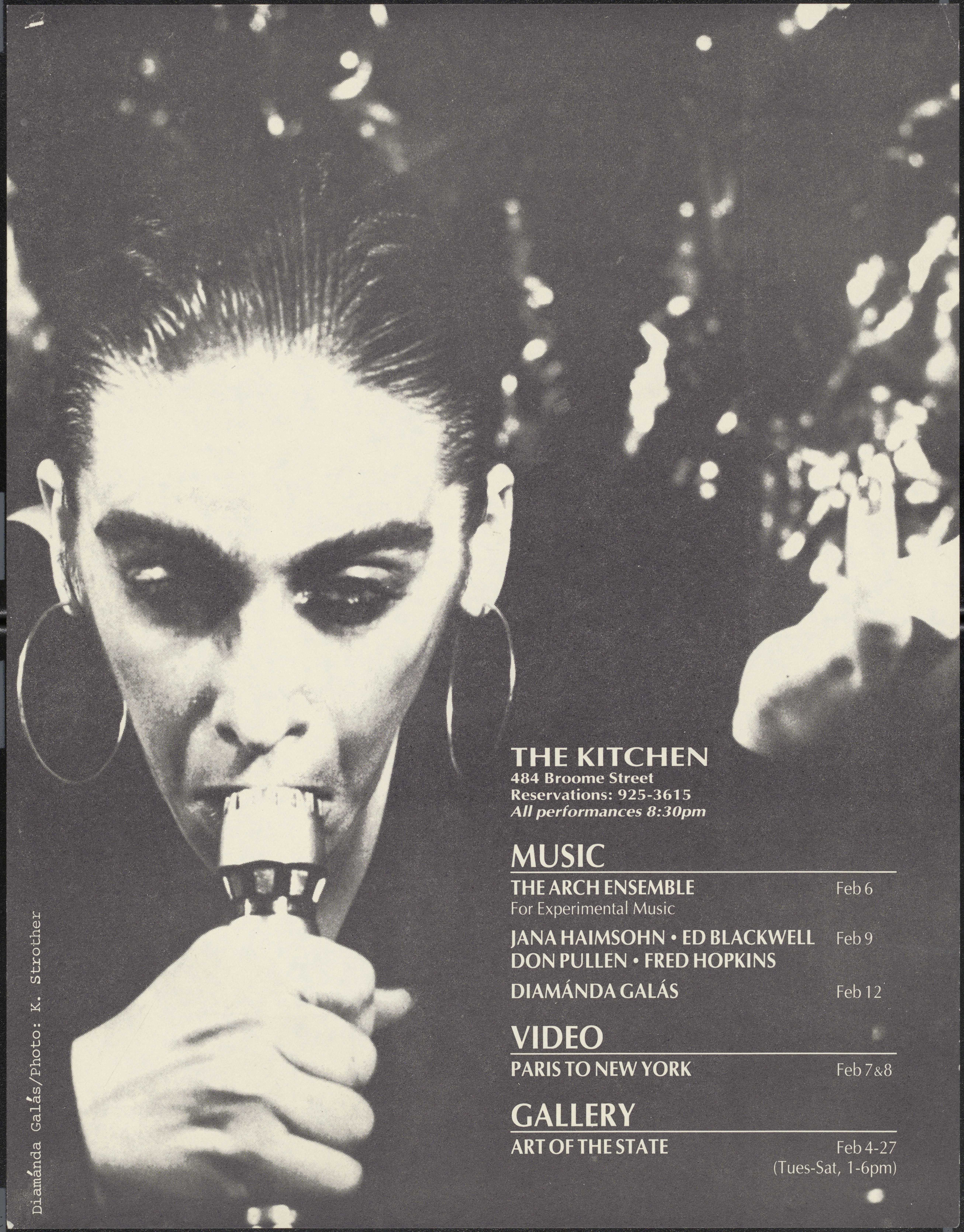 February 1982 Poster Calendar with a picture of Diamánda Galás by K. Strother. The month featured MUSIC programs with The Arch Ensemble, Jana Haimsohn and Ed Blackwell, Don Pullen and Fred Hopkins, and Diamánda Galás. There was a video program titled "Paris to New York" and the show "Art of the State" was in the gallery.
