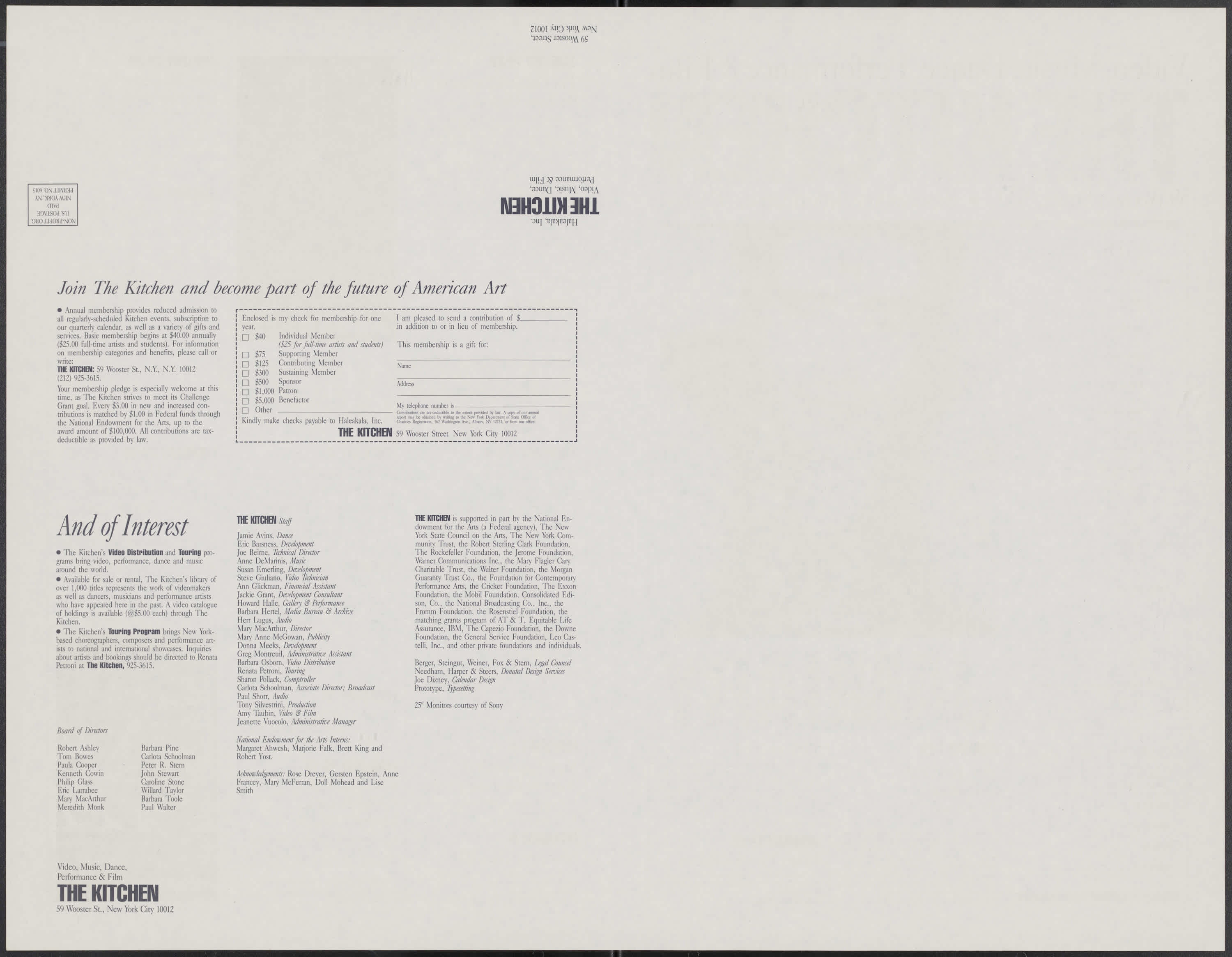 The Kitchen Calendar for January and February, 1984. Features Nam June Paik, Tim Burns, Christopher Berg and "Blue" Gene Tyranny, Eric Bogosian, Glenn Branca, Amine Claudine Myers, and Ishmael Houston Jones/Fred Holland.