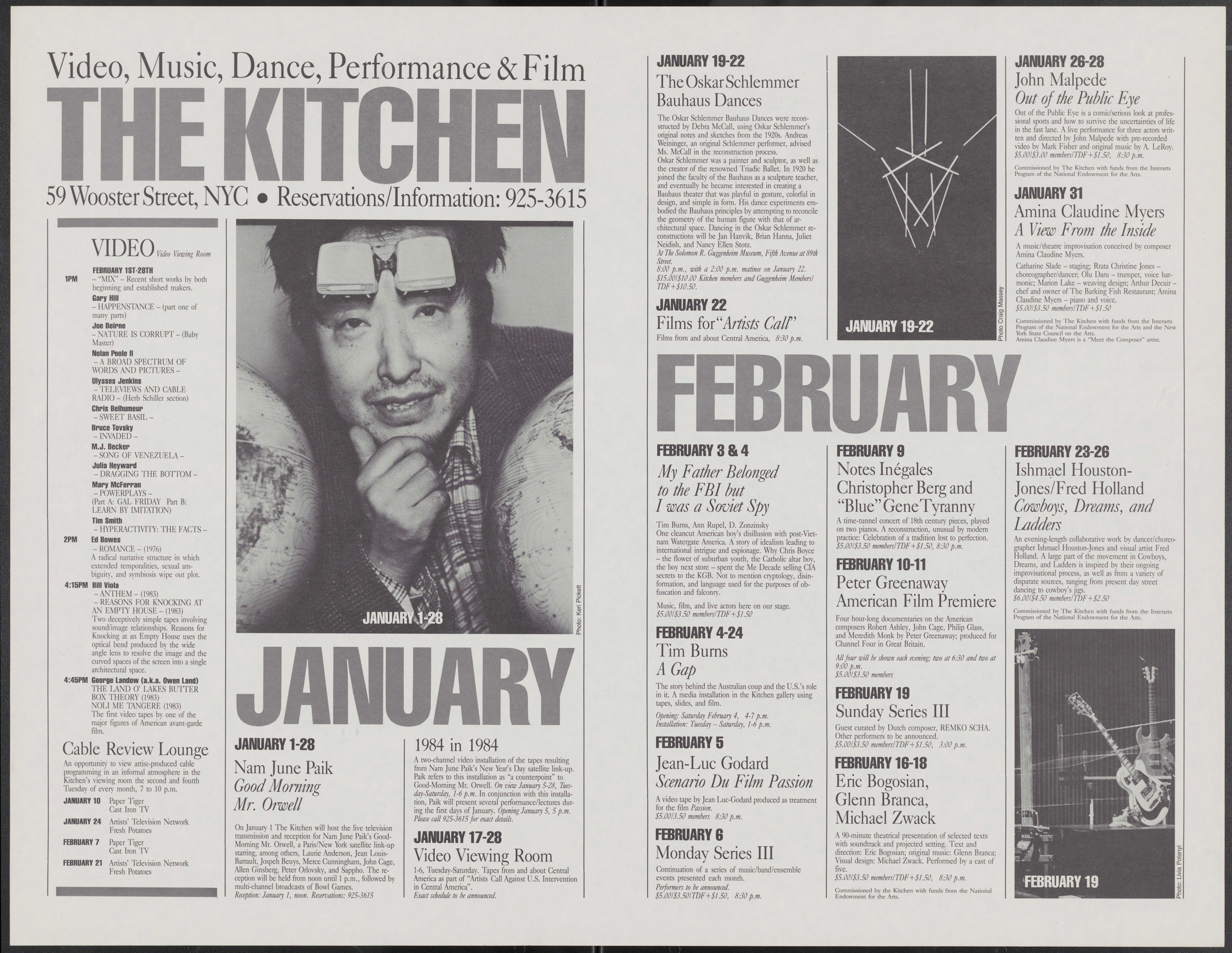 The Kitchen Calendar for January and February, 1984. Features Nam June Paik, Tim Burns, Christopher Berg and "Blue" Gene Tyranny, Eric Bogosian, Glenn Branca, Amine Claudine Myers, and Ishmael Houston Jones/Fred Holland.