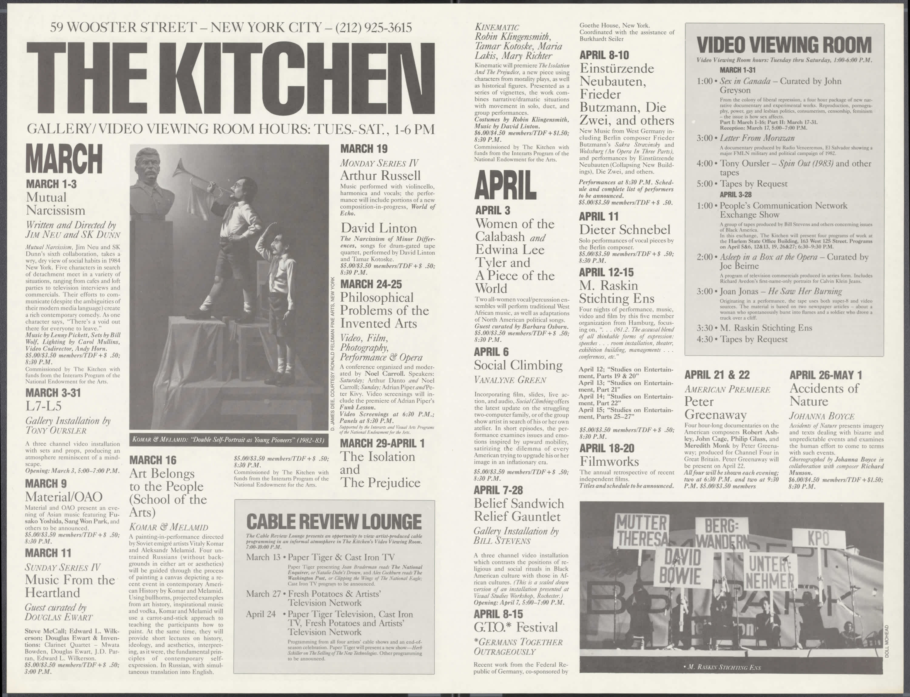 March-April 1979 Calendar featuring the Cable Review Lounge, Video Viewing Room, Filmworks, and the following line up of artists: Jim Neu, SK Dunn, Tony Oursler, Fusako Yoshida, Sang Won Park, Douglas Ewart, Steve McCall, Edward L. Wilkerson, Mwata Bowden, J.D. Parran, Vitaly Komar, Aleksandr Melamid, Arthur Russell, David Linton, Noel Carroll, Adrian Piper, Einstürzende, Frieder Butzmann (composer), Die Zwei,Dieter Schnebel, Joan Jonas, Joe Beirne, Peter Greenaway, Robert Ashley, John Cage, Meredith Monk, Johanna Boyce, Richard Munson