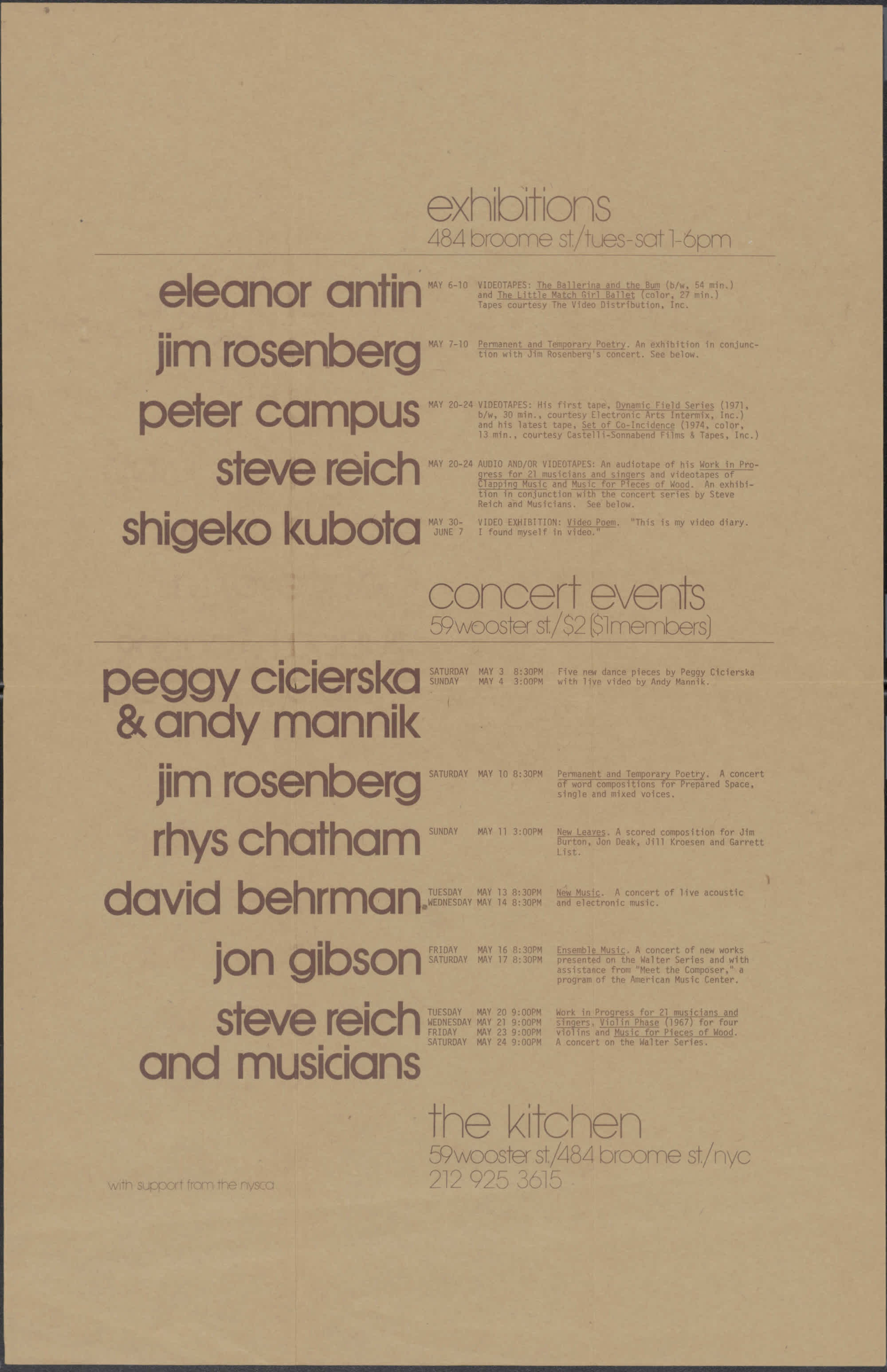 Kitchen Calendar from May, 1975. Features Eleanor Antin, Peter Campus, Shigeko Kubota, Jon Gibson, Steve Reich, and others.