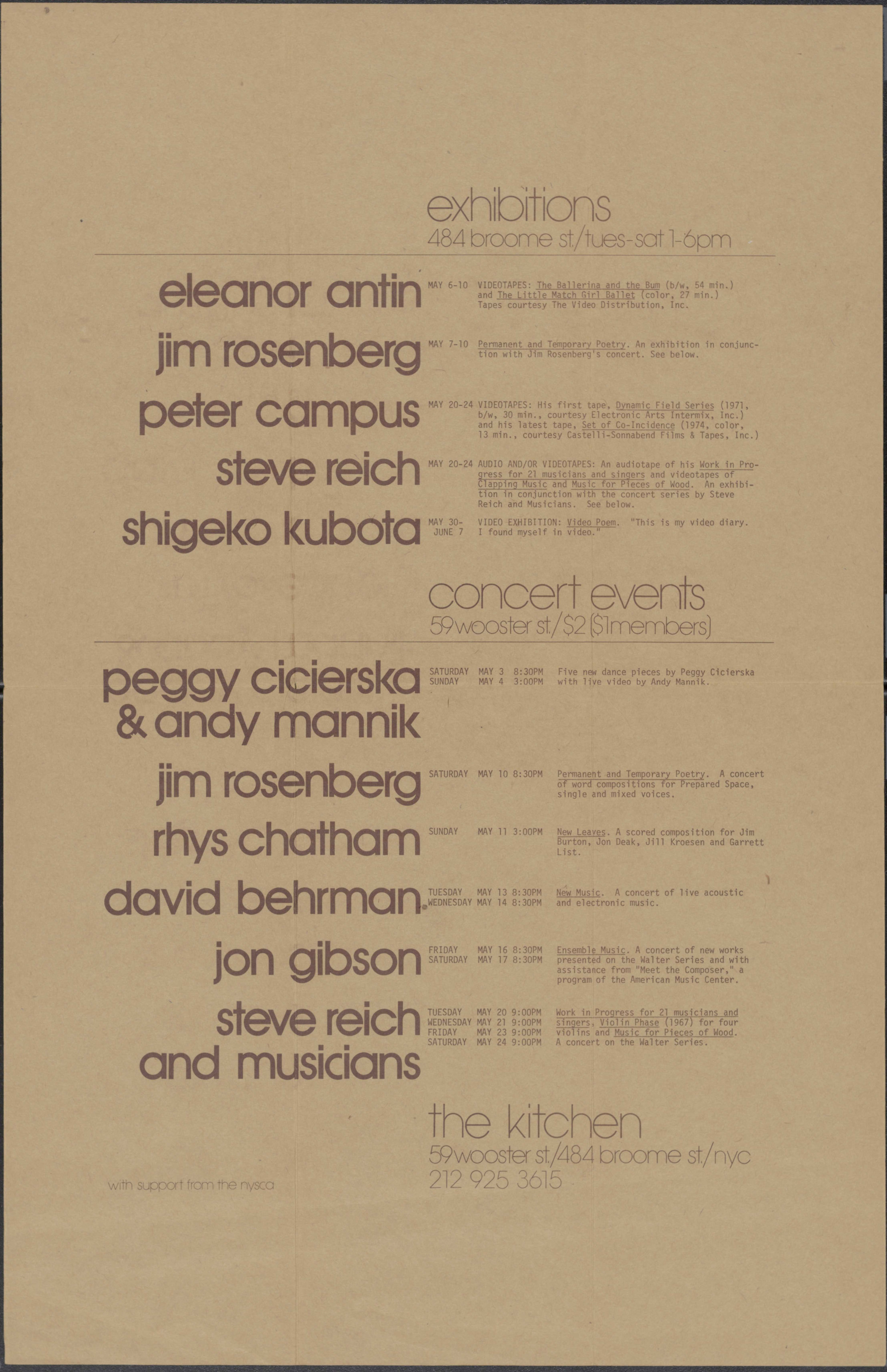 Kitchen Calendar from May, 1975. Features Eleanor Antin, Peter Campus, Shigeko Kubota, Jon Gibson, Steve Reich, and others.
