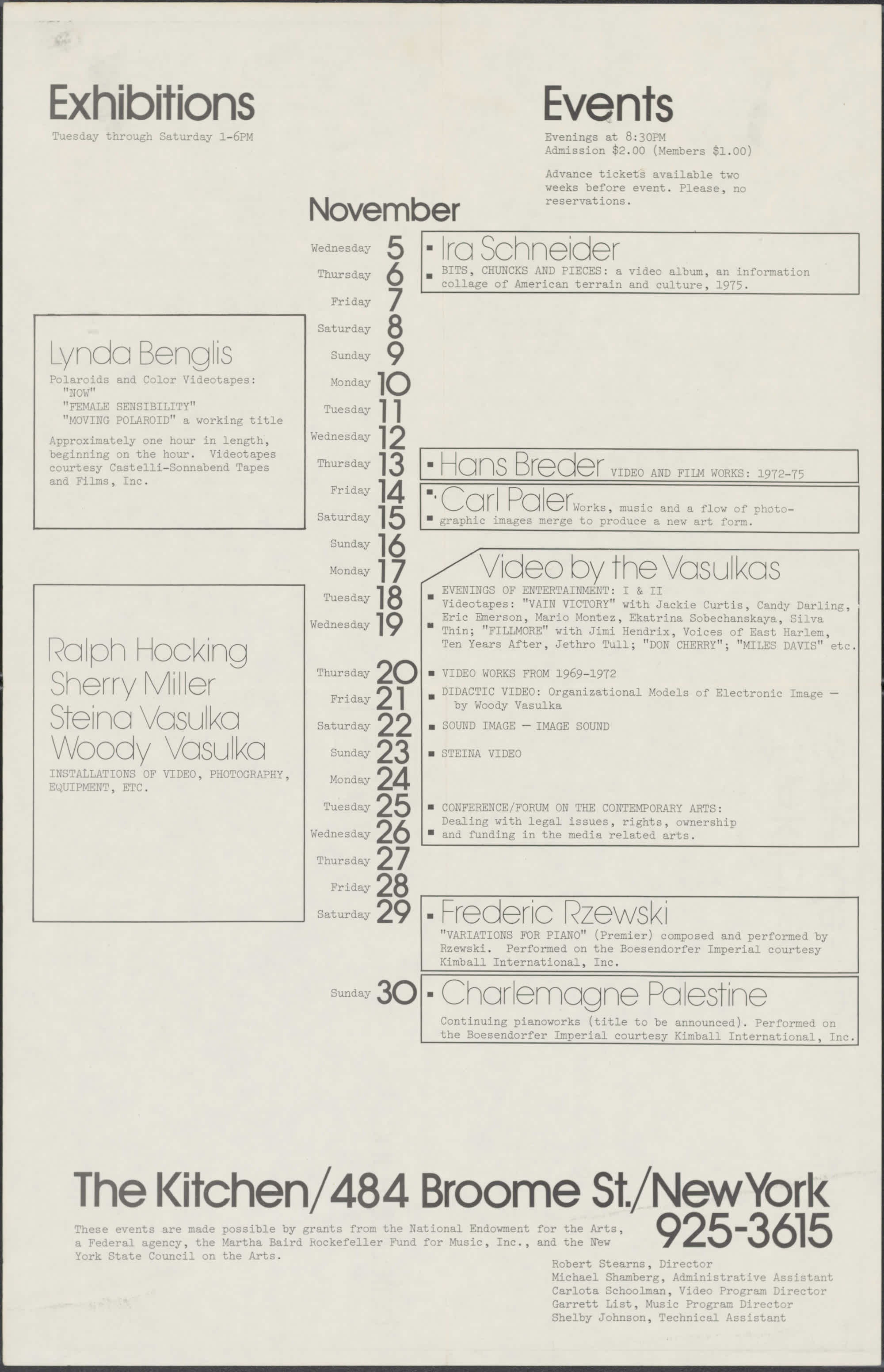 Kitchen Calendar from November, 1975. Features the Vasulkas, Lynda Benglis, Frederic Rzewski, and Charlemagne Palestine amongst others.