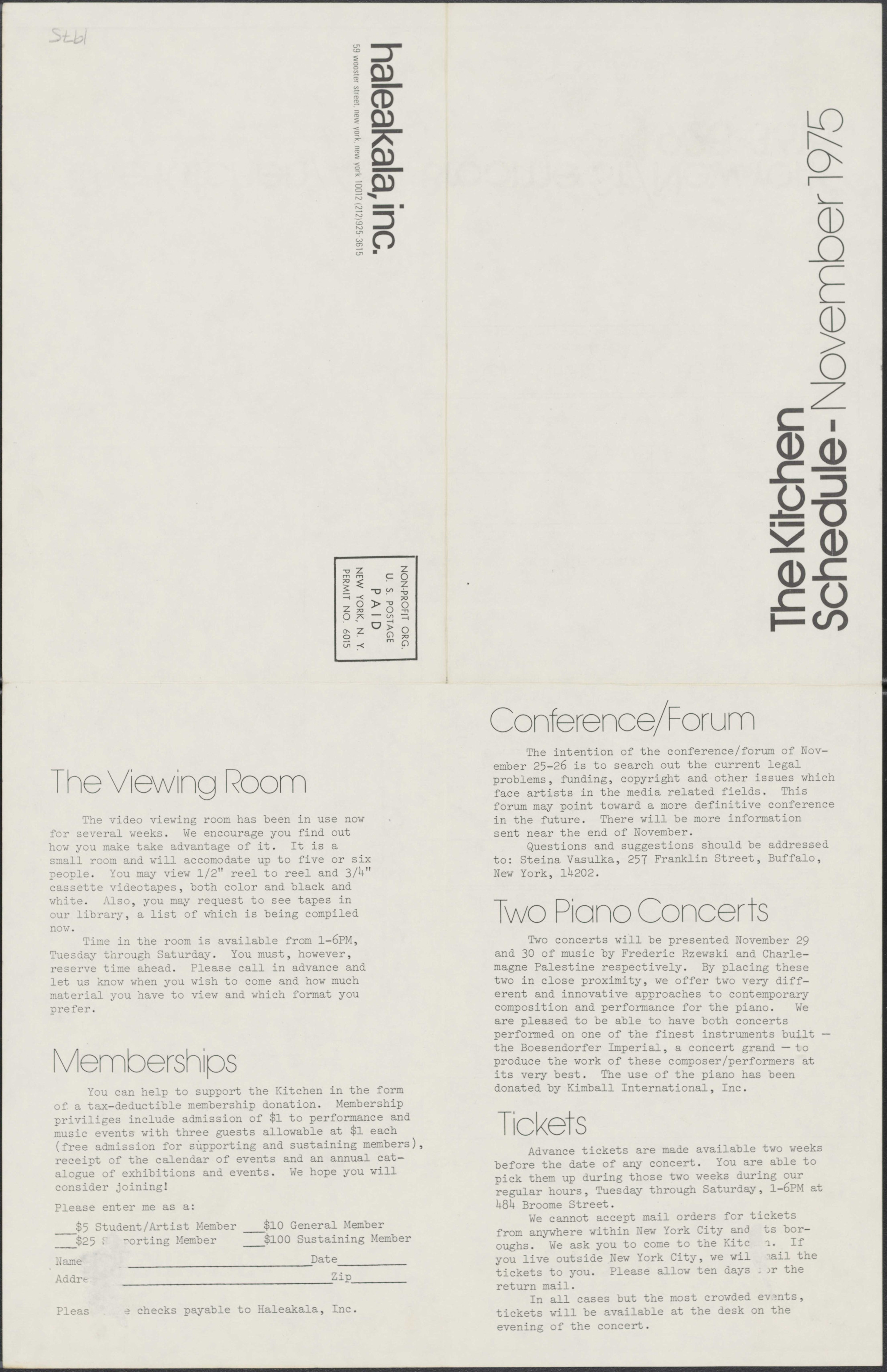 Kitchen Calendar from November, 1975. Features the Vasulkas, Lynda Benglis, Frederic Rzewski, and Charlemagne Palestine amongst others.