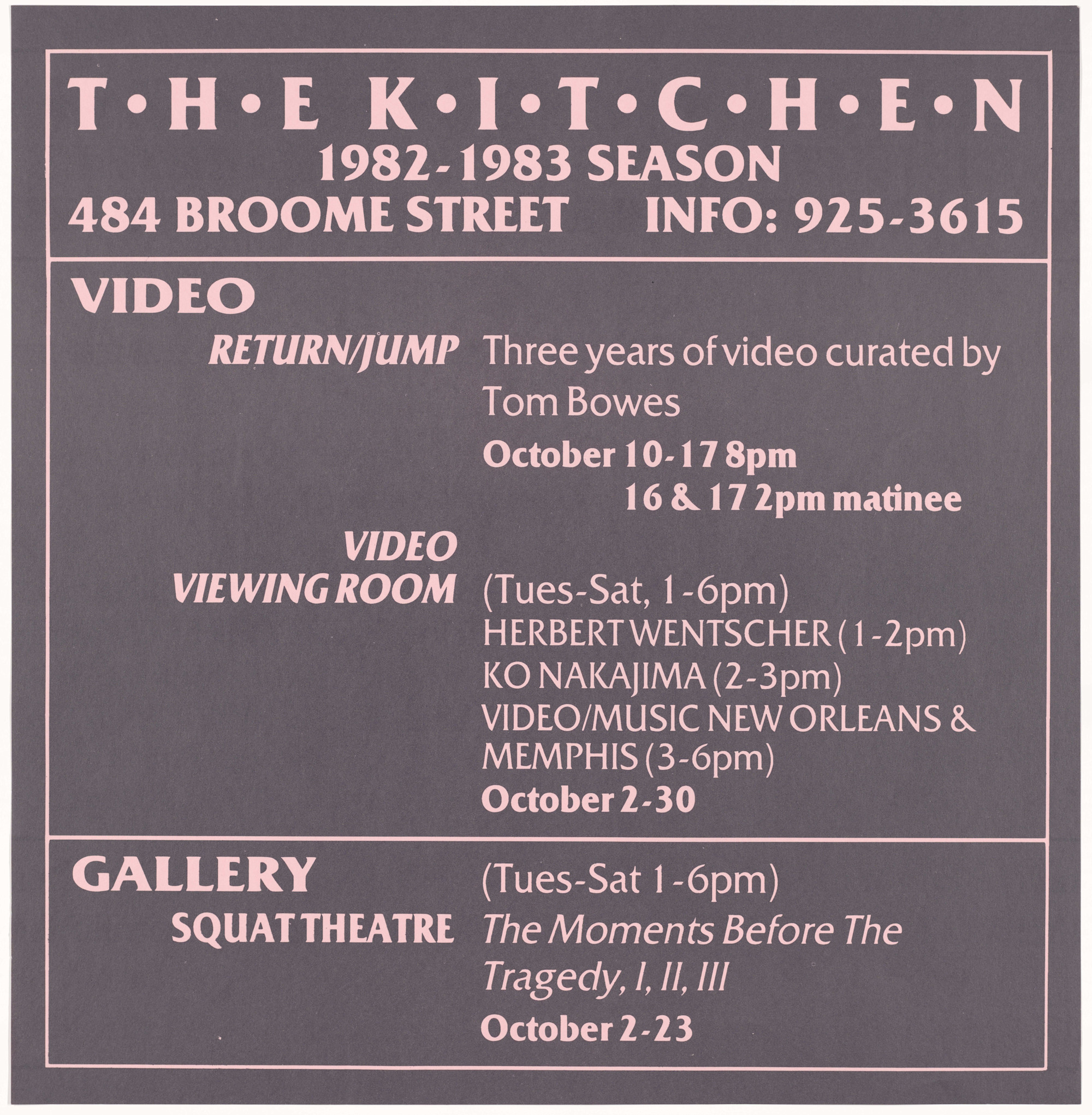 Pink and Black version of the October 1982 Calendar Poster. Featuring the performance "Crash Course" by Beth Lapides, video works by Tom Bowes, Herbert Wentscher, and Ko Nakajima, and the Squat Theatre in the gallery.