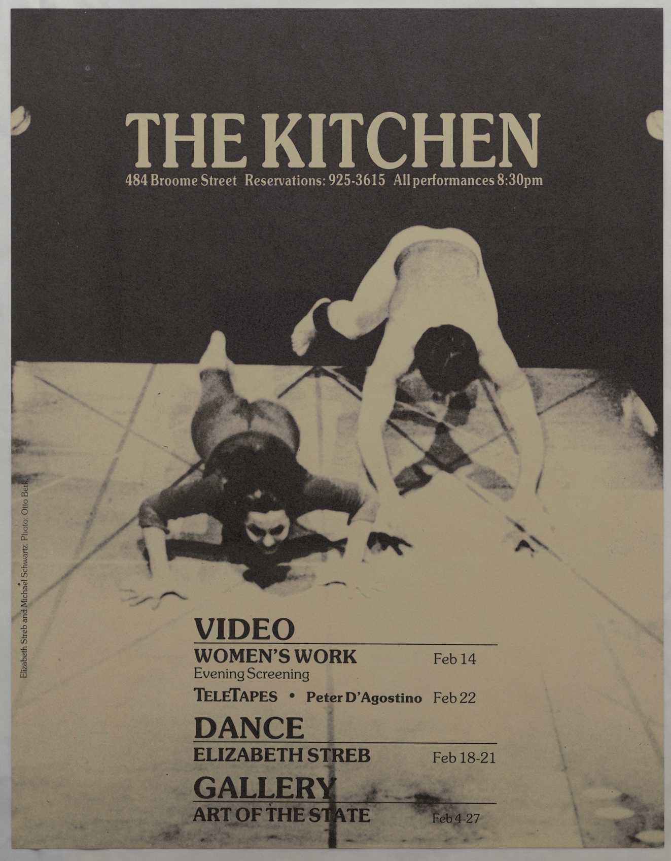 Video: Women's Work, Feb 14 Evening Screening. TeleTapes: Peter D'Agostino, Feb 22. Dance: Elizabeth Streb Feb 18-21. Gallery: Art of the State: Feb 4-27. Elizabeth Streb and Michael Schwartz, photo by: Otto Berk