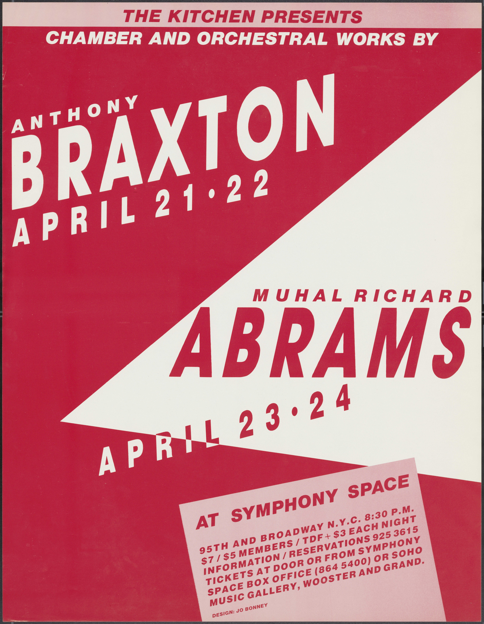 The Kitchen Presents Chamber and Orchestral Works by Anthony Braxton (April 21 and 22) and Muhal Richard Abrams (April 23 and 24) at Symphony Space. Design: Jo Bonney.