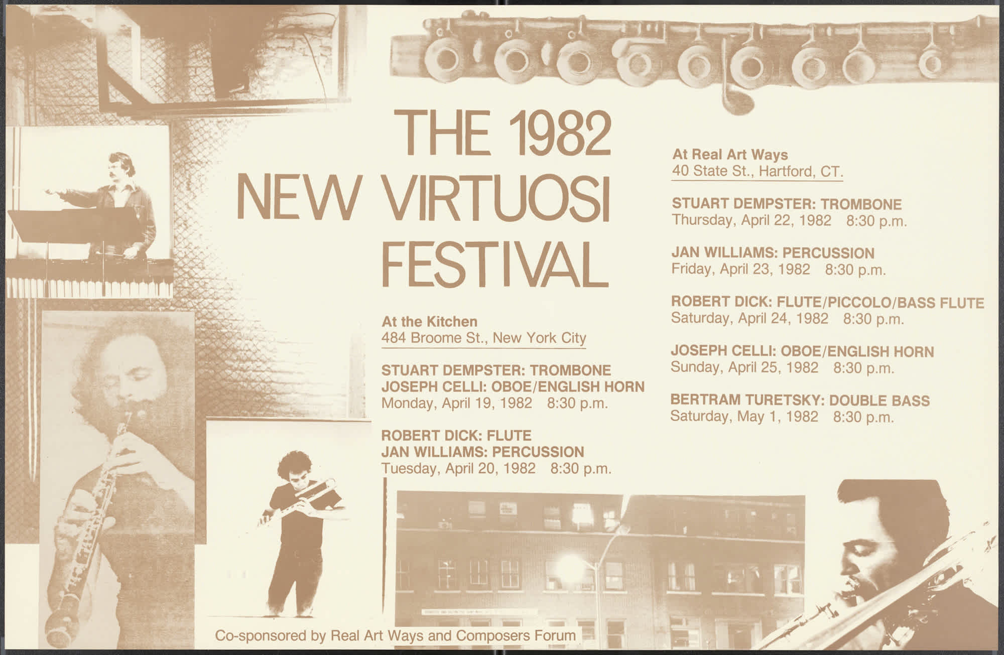 The 1982 New Virtuosi Festival At The Kitchen and At Real Art Ways (Hartford, CT). With Stuart Dempster, Jan Williams, Robert Dick, Joseph Celli, and Bertram Turetsky. Co-sponsored by Real Art Ways and Composers Forum.