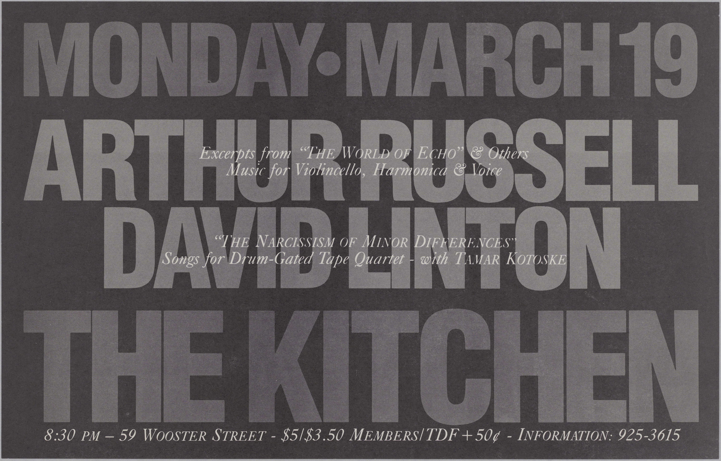 For a single evening, Arthur Russell presented three pieces performed on violoncello, harmonica, and vocals, and David Linton presented four pieces, including the premiere of N.O.M.D. (The Narcissism of Minor Differences), created in collaboration with choreographer Tamar Kotoske. In Linton’s headlining piece, live drumming initiated a layered sequence of pre-recorded tape tracks “toward the shaping of songs normally associated with the band context.” The work gestured to Linton’s involvement with the New York downtown music scene and was set in dialogue with Russell’s shared engagement with experimental composition, as well as more popular forms such as disco and folk.