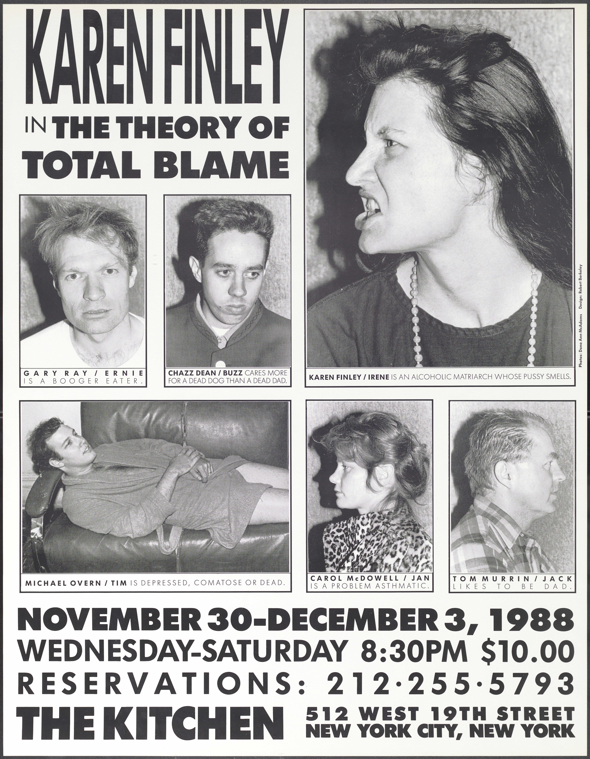 Karen Finley In the Theory of Total Blame. Gary Ray / Ernie is a Booger Eater; Chazz Dean / Buzz cares more for a dead dog than dead dad. Karen Finley / Irene is an alcoholic matriarch whose pussy smells. Michael Overn / Tim is depressed, comatose, or dead. Carole McDowell / Irene is a problem asthmatic. Tom Murrin / Jack likes to be dad. November 30-December 3, 1988; Wednesday-Saturday 8:30PM $10.00. Photos: Dona Ann McAdams, Design: Robert Berkeley.