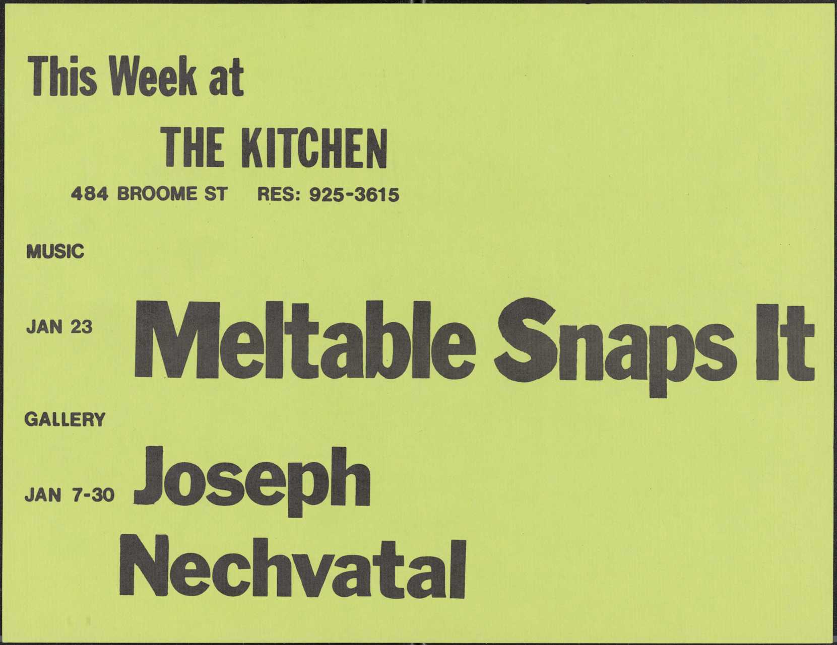 Poster/Calendar featuring one week in January of 1982. Meltable Snaps It (associated with David Moss) performed and Joseph Nechvatal had an exhibition in the Gallery from January 7-30.
