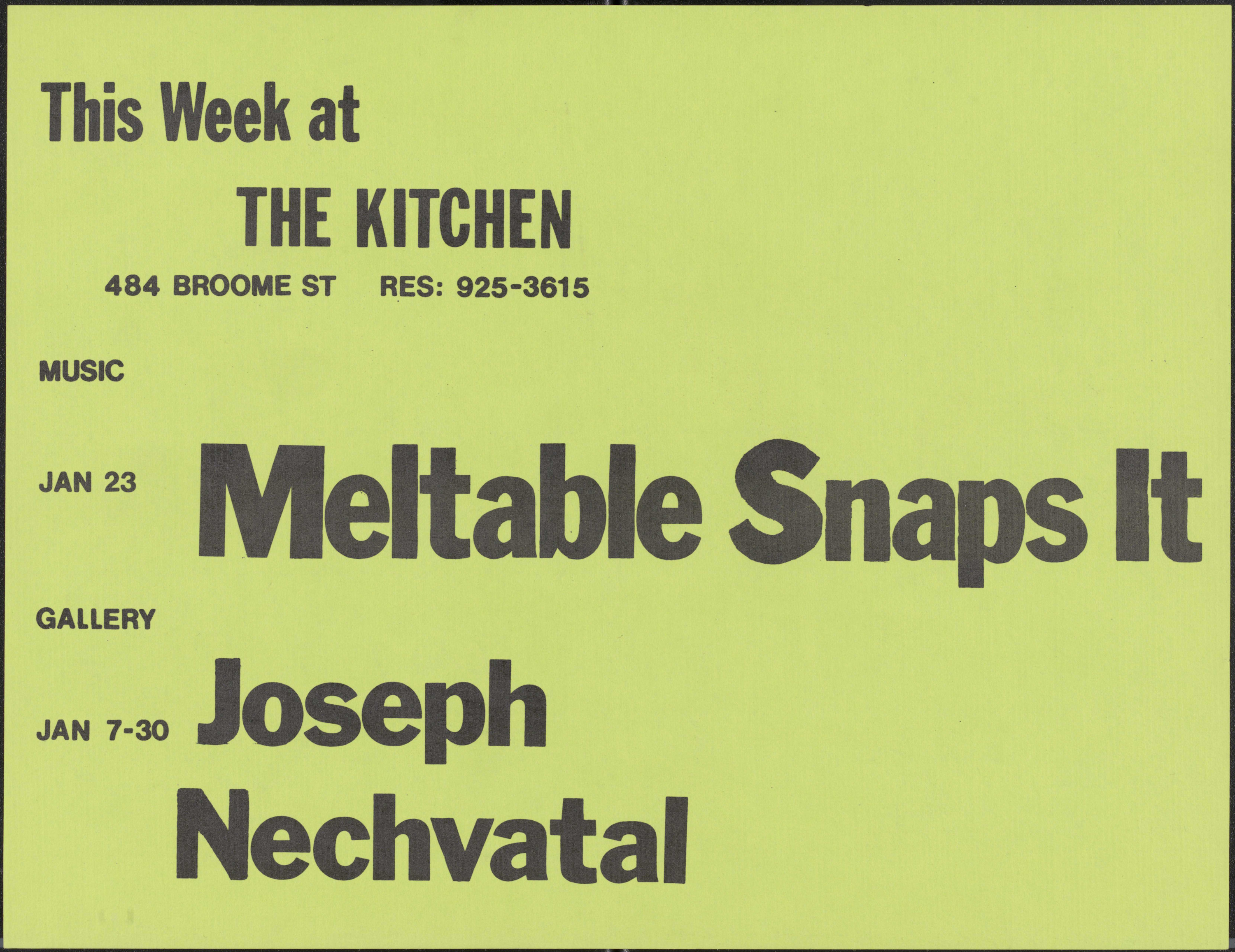 Poster/Calendar featuring one week in January of 1982. Meltable Snaps It (associated with David Moss) performed and Joseph Nechvatal had an exhibition in the Gallery from January 7-30.