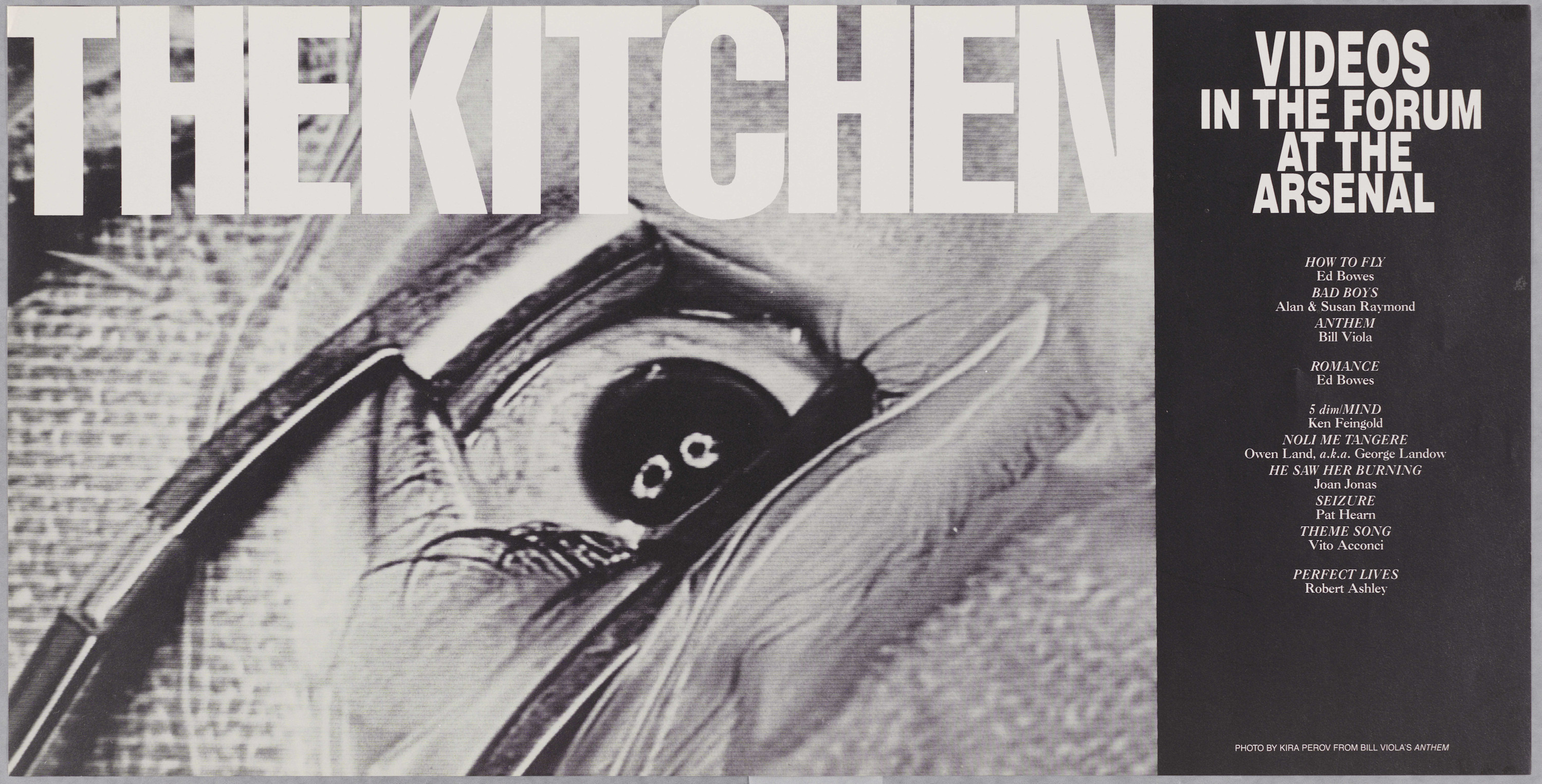 THE KITCHEN: Videos in The Forum at The Arsenal. "How To Fly" by Ed Bowes, "Bad Boys" by Alan and Susan Raymond, "Anthem" by Bill Viola; "Romance" by Bill Viola, "He Saw Her Burning" by Joan Jonas, "Perfect Lives" by Robert Ashley, and others.