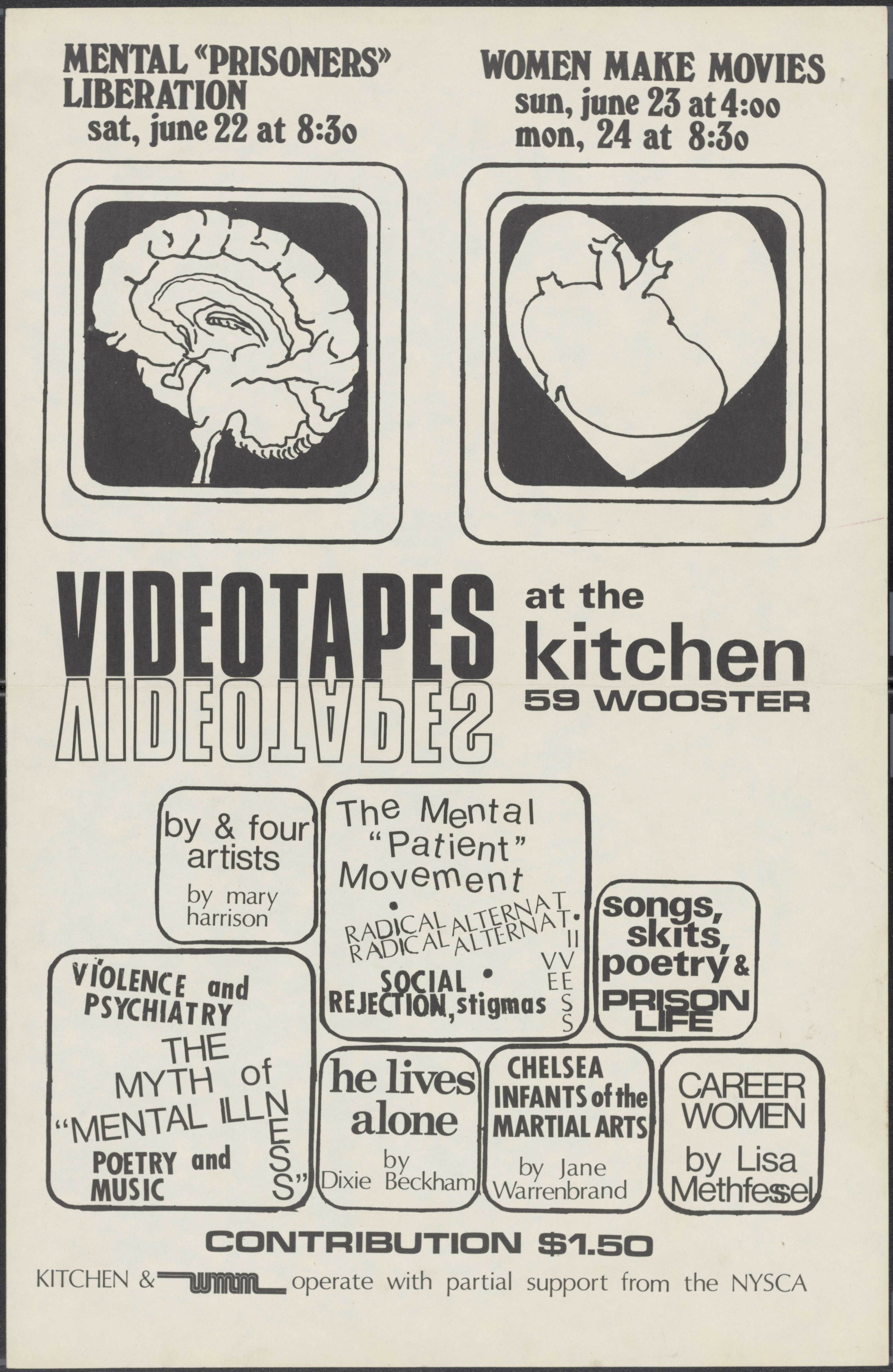 Videotapes at The Kitchen. "Mental Prisoners Liberation", June 22 at 8:30pm. "Women Make Movies", June 23 and 24, at 8:30pm. Featured: Mary Harrison, Dixie Beckham, Jane Warrenbrand, Lisa Methfessel, and others.