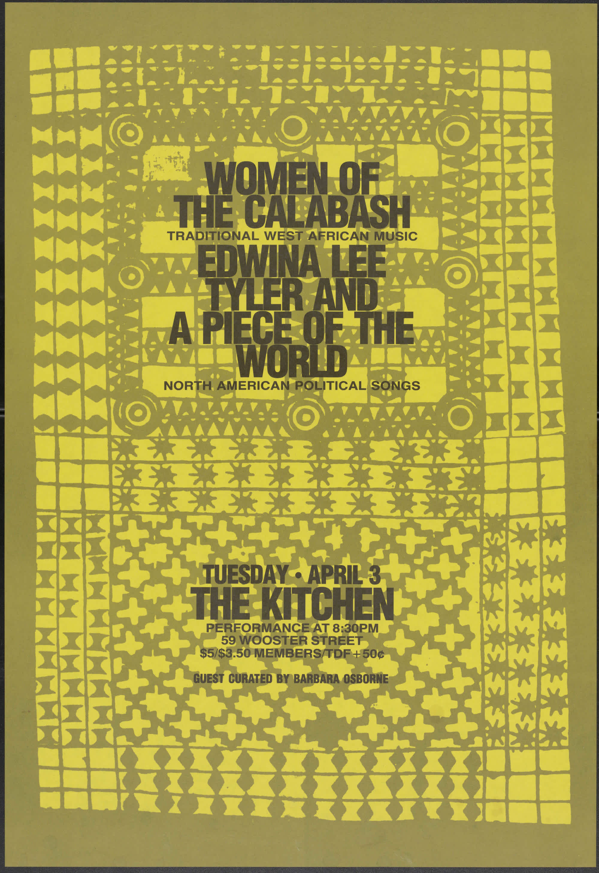 In the spring of 1984, two all-female bands, Women of the Calabash and Edwina Lee Tyler and a Piece of the World, performed at The Kitchen. Led by composer and percussionist Madeleine Yayodele Nelson, Women of the Calabash presented songs that incorporated music rooted in African, Caribbean, and Black American cultures. They played with all natural percussion instruments, including the calabash, a dried gourd, that is beaded and played as rattles. Edwina Lee Tyler performed with her group, A Piece of the World, playing extended drum pieces and featuring dances by Tyler. Their performance also utilized traditional instruments, including the djimbé, a goblet drum, and a balophone, a kind of wooden xylophone.