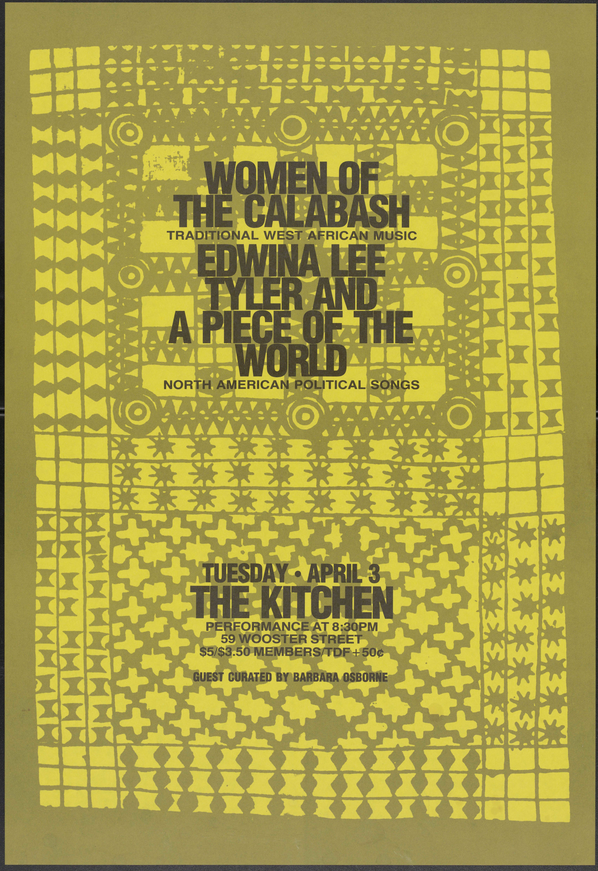 In the spring of 1984, two all-female bands, Women of the Calabash and Edwina Lee Tyler and a Piece of the World, performed at The Kitchen. Led by composer and percussionist Madeleine Yayodele Nelson, Women of the Calabash presented songs that incorporated music rooted in African, Caribbean, and Black American cultures. They played with all natural percussion instruments, including the calabash, a dried gourd, that is beaded and played as rattles. Edwina Lee Tyler performed with her group, A Piece of the World, playing extended drum pieces and featuring dances by Tyler. Their performance also utilized traditional instruments, including the djimbé, a goblet drum, and a balophone, a kind of wooden xylophone.