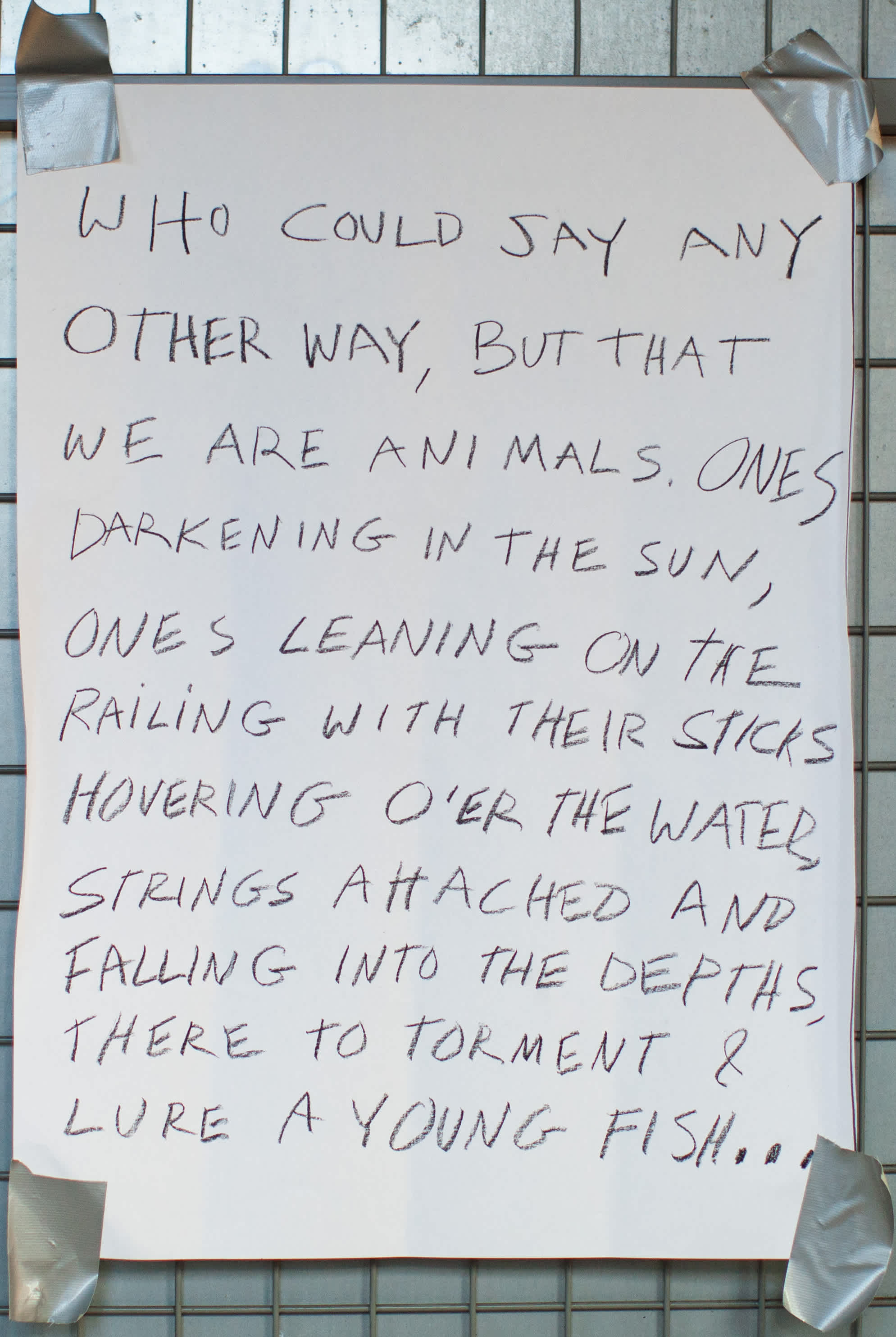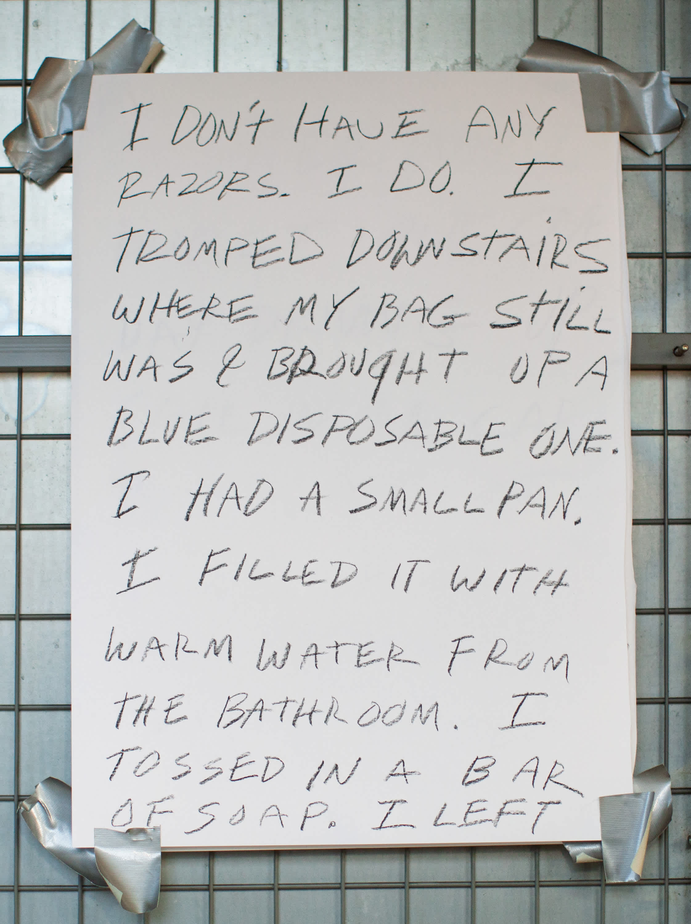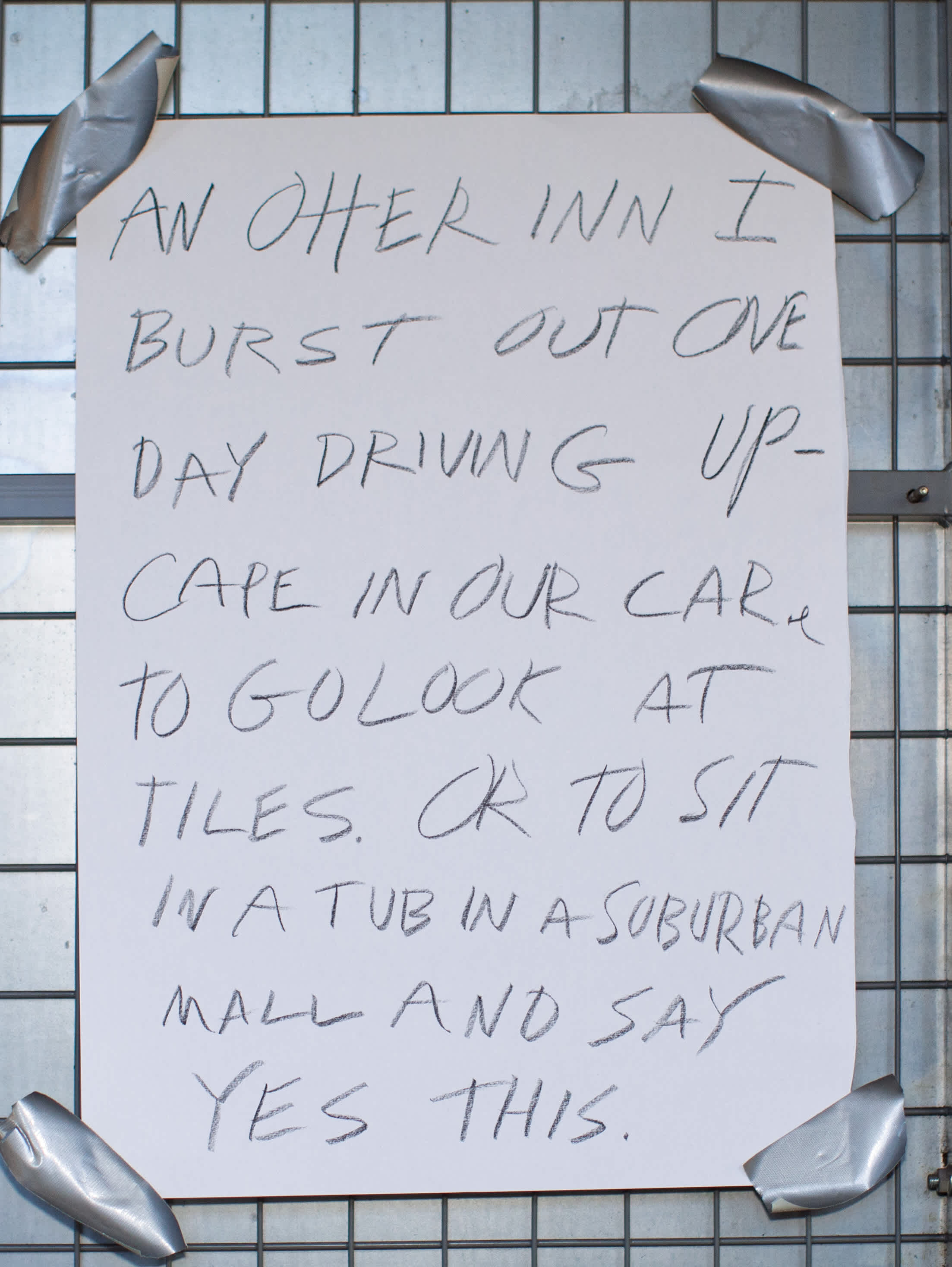 These sheets are a calendar of the days I spent at Lofoten. Which is now a bumper sticker on my truck in Texas. When I was initially invited Kjersti Solbakken encouraged me to do some kind of installation and since I was the only “non-visual” artist in the festival it seemed I should also be present. And of course there’s no such thing as non-visual. Right? So I did my official reading one day but based on the photographs Kjersti had sent of the various spaces I could occupy I chose this one - that I forget – no thank god for Instagram the space was called gangen which sounds like it just means hall. I gave mini readings in gangen like 10 minutes each day from my novel in progress and also just kind of daily poem things about the genocide in the middle east and a poet’s relation to that I guess in history and I posted a bit of these things on the wall in these nice plexi slots that somehow reminded me of Canal Street. One day no one came to the mini reading and I wondered if I should read aloud anyhow but I didn’t couldn’t. It felt too hollow.